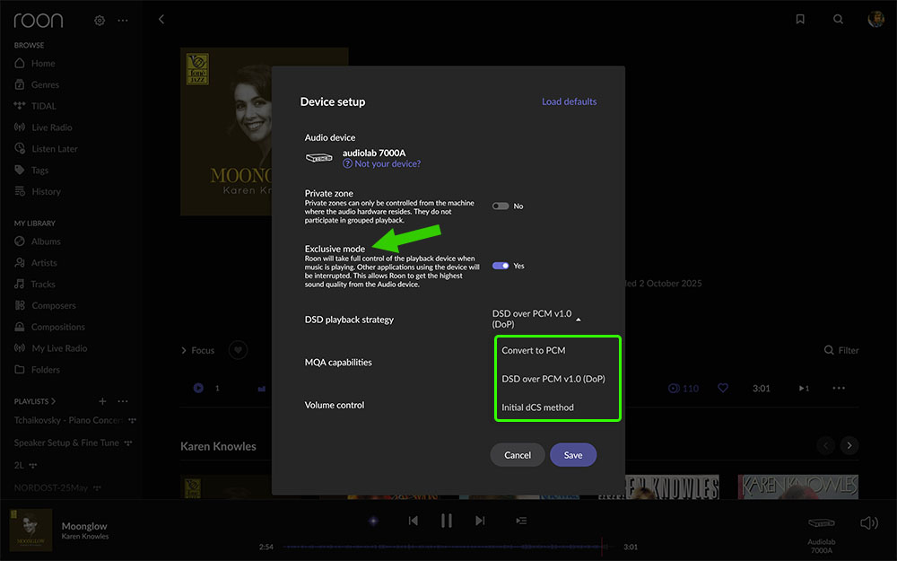 ส่วนหัวข้อ ‘DSD Playback Strategy’ หรือวิธีการเล่นสัญญาณ DSD พบว่า Roon เสนออ๊อปชั่นให้เลือกใช้ 3 วิธี คือ แปลงเป็น PCM (Convert to PCM), แปลงเป็นฟอร์แม็ต DoP (DSD over PCM v1.0) หรือ ใช้ฟอร์แม็ต initial dCS method ไม่มีอ๊อปชั่น ‘Native’ ขึ้นมาให้เลือก แสดงว่า ภาค DAC ในตัว 7000A ไม่รองรับสัญญาณ DSD แบบเนทีฟ