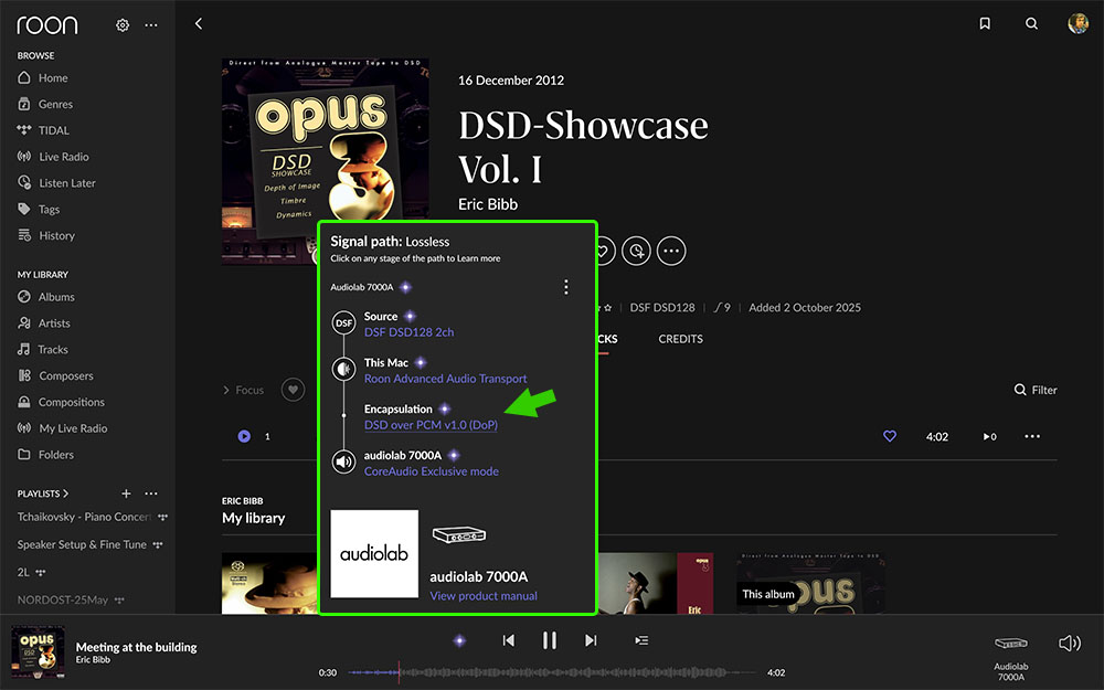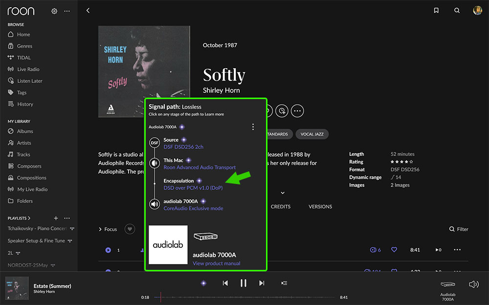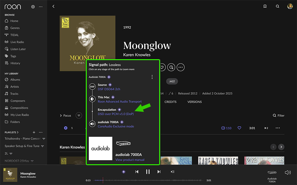 ขั้นตอนต่อไปคือการทดสอบดูว่า ภาค DAC ในตัว 7000A รองรับสัญญาณ DSD ได้สูงสุดถึงระดับไหน.? ภาพข้างบนคือตอนเล่นไฟล์เพลง DSF64 จะเห็นว่าโปรแกรม Roon แจ้งว่ารูปแบบการเล่นคือฟอร์แม็ต DoP