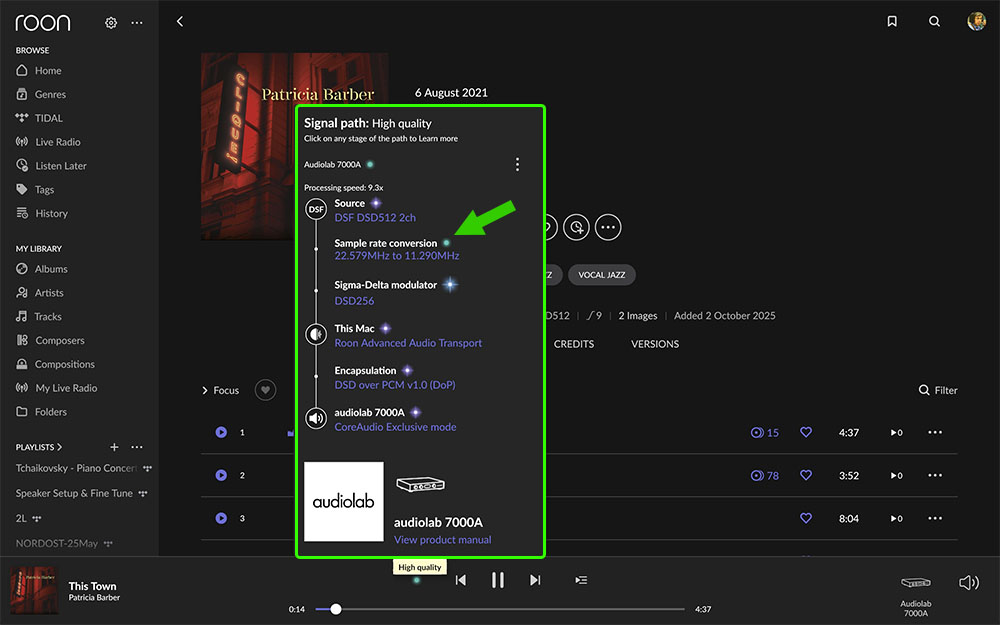 ภาพข้างบนคือตอนลองเล่นไฟล์ DSF512 พบว่า โปรแกรม Roon ทำการแปลงไฟล์ DSF512 ลงมาเป็น DSF256 ด้วยวิธีแปลงกลับไปกลับมาระหว่างฟอร์แม็ต DSD กับฟอร์แม็ต PCM (delta-sigma modulator) แสดงว่าภาค DAC ในตัว 7000A ไม่รองรับการเล่นไฟล์ DSF512 ตรงๆ ถ้า Roon ไม่แปลงลงมาเป็น DSF256 ให้ก็คงไม่เล่น สรุปคือ ภาค DAC ในตัว 7000A รองรับไฟล์ DSF ได้สูงสุดแค่ DSD256 เท่านั้น