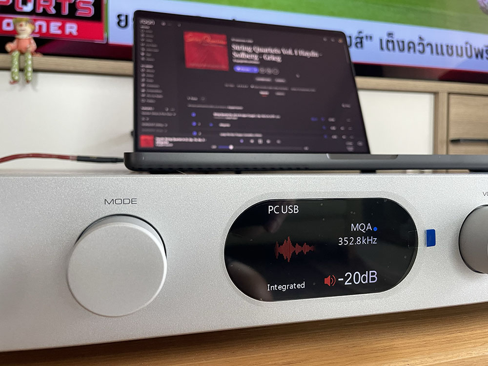 จากการทดสอบในลักษณะที่ใช้ทรัพยากรครบทุกส่วนด้วยการเลือกใช้โหมด ‘Integrated’ คือใช้ภาค DAC + ภาค Pre + ภาค Power ทำงานร่วมกัน ซึ่งผลที่ได้ยินก็ต้องยอมรับว่า Audiolab ออกแบบ “อัตราขยาย” ของทั้งภาค Pre และภาค Power ในตัวมันออกมาได้ลงตัวกับ gain ของภาคอะนาลอก เอ๊าต์พุตของชิป DAC เบอร์ ES9038Q2M อย่างมาก ถือว่าเป็นความสำเร็จในการออกแบบภาคแอมป์ที่มีประสิทธิภาพ “ลงตัว” กับเอ๊าต์พุตของชิป DAC ของ ESS Technologies แบบเดียวกับรุ่น 6000A ที่ประสบความสำเร็จอย่างสูงตัวหนึ่งในวงการ จนเป็นที่ยอมรับกันอย่างกว้างขวางว่า วิศวกรของ Audiolab ประสบความสำเร็จในการออกแบบภาคแอมป์ (ปรี+เพาเวอร์ฯ) ให้ทำงานร่วมกับสัญญาณอะนาลอก เอ๊าต์พุตของชิป DAC จากค่าย ESS Technologies ได้อย่างมีประสิทธิภาพมากที่สุด มีการจัดการกับ distortion + noise ของภาคแอมป์ได้ดี คือ gain ไม่สูงเกินไปจนเกิด distortion และไม่ต่ำเกินไปจนขาดพลัง