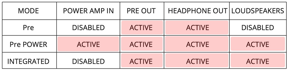 ปุ่มที่สองชื่อว่า MODE (B) ถูกกำหนดให้ทำหน้าที่เลือกโหมดการทำงานของ 7000A ที่มีให้เลือกจำนวน 3 โหมด คือ Pre, Integrated และ Pre-Power ซึ่งโหมด Pre กับโหมด Pre-Power นั้นจะสอดคล้องกับการเชื่อมต่อสัญญาณที่ช่อง Pre Out และช่อง Power In (M) ด้วย ซึ่งคุณสมบัติข้อนี้เอามาจากรุ่น 9000N ซึ่งเป็นฟังท์ชั่นที่ดีมากๆ โดยเฉพาะตอนที่เลือกใช้โหมด Pre เพื่อป้อนสัญญาณภาคปรีฯ ของ 7000A ไปใช้กับเพาเวอร์แอมป์ภายนอก ซึ่งเป็นการอัพเกรดประสิทธิภาพทางด้านกำลังขับของ 7000A ขึ้นไป หรือจะส่งออกไปใช้งานร่วมกับลำโพงแอ๊คทีฟซับวูฟเฟอร์ภายนอกนั้น การทำงานของภาคเพาเวอร์แอมป์ในตัว 7000A จะถูกปิดลง เพื่อสงวนกำลังของภาคเพาเวอร์ซัพพลายทั้งหมดไปใช้กับภาค DAC และภาคปรีแอมป์เท่านั้น ซึ่งนอกจากจะได้ผลดีทางด้านสมรรถนะแล้ว การปิดการทำงานของภาคเพาเวอร์แอมป์ยังช่วยลด noise ลงไปได้อีกทางหนึ่งด้วย