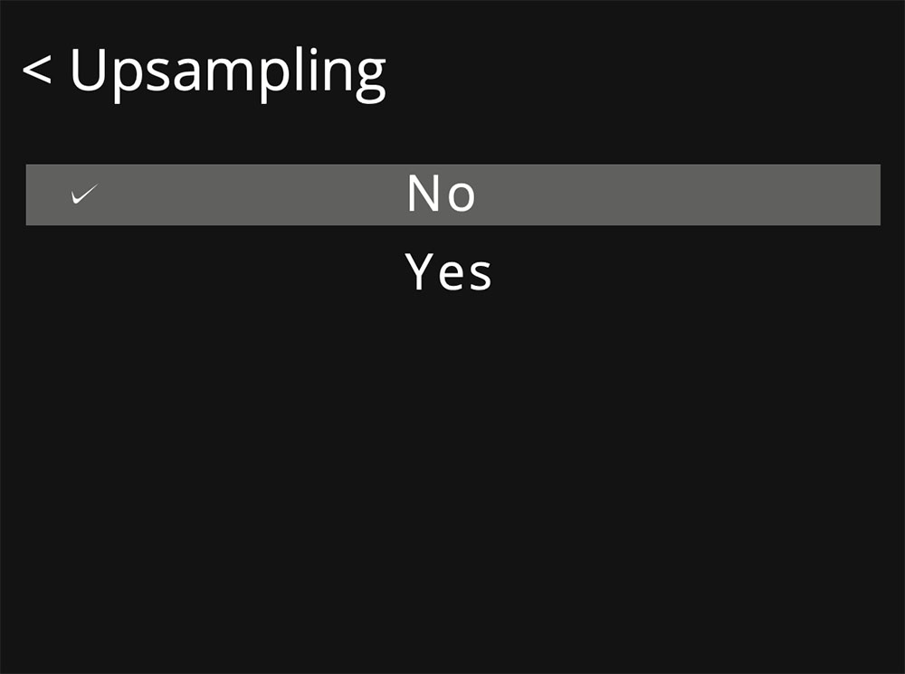 วงจร Upsampling นี้จะทำงานโดยอัตโนมัติ ถ้าคุณเข้าไปปรับตั้งคำสั่งที่หัวข้อเมนู Upsampling ในเมนูของ 7000A ไปที่ตำแหน่ง ‘Yes’ แต่ถ้าคุณชอบโทนเสียงของไฟล์เพลงที่ระดับแซมปลิ้งเรตเดิม (original sampling rate) คุณก็สามารถสั่งปิดการทำงานของวงจรอัพแซมปลิ้งได้ด้วยการเข้าไปปรับตั้งคำสั่งที่หัวข้อเมนู Upsampling ไปไว้ที่ตำแหน่ง ‘No’ อันนี้แนะนำให้ทดลองฟังความแตกต่างดูก่อน แล้วเลือกอ๊อปชั่นที่คุณชอบ ซึ่งผลความแตกต่างทางเสียงของทั้งสองอ๊อปชั่นนี้ (‘Yes’ หรือ ‘No’) จะขึ้นอยู่กับอุปกรณ์ในซิสเต็มของคุณ และขึ้นอยู่กับรสนิยมในการฟังของคุณด้วย