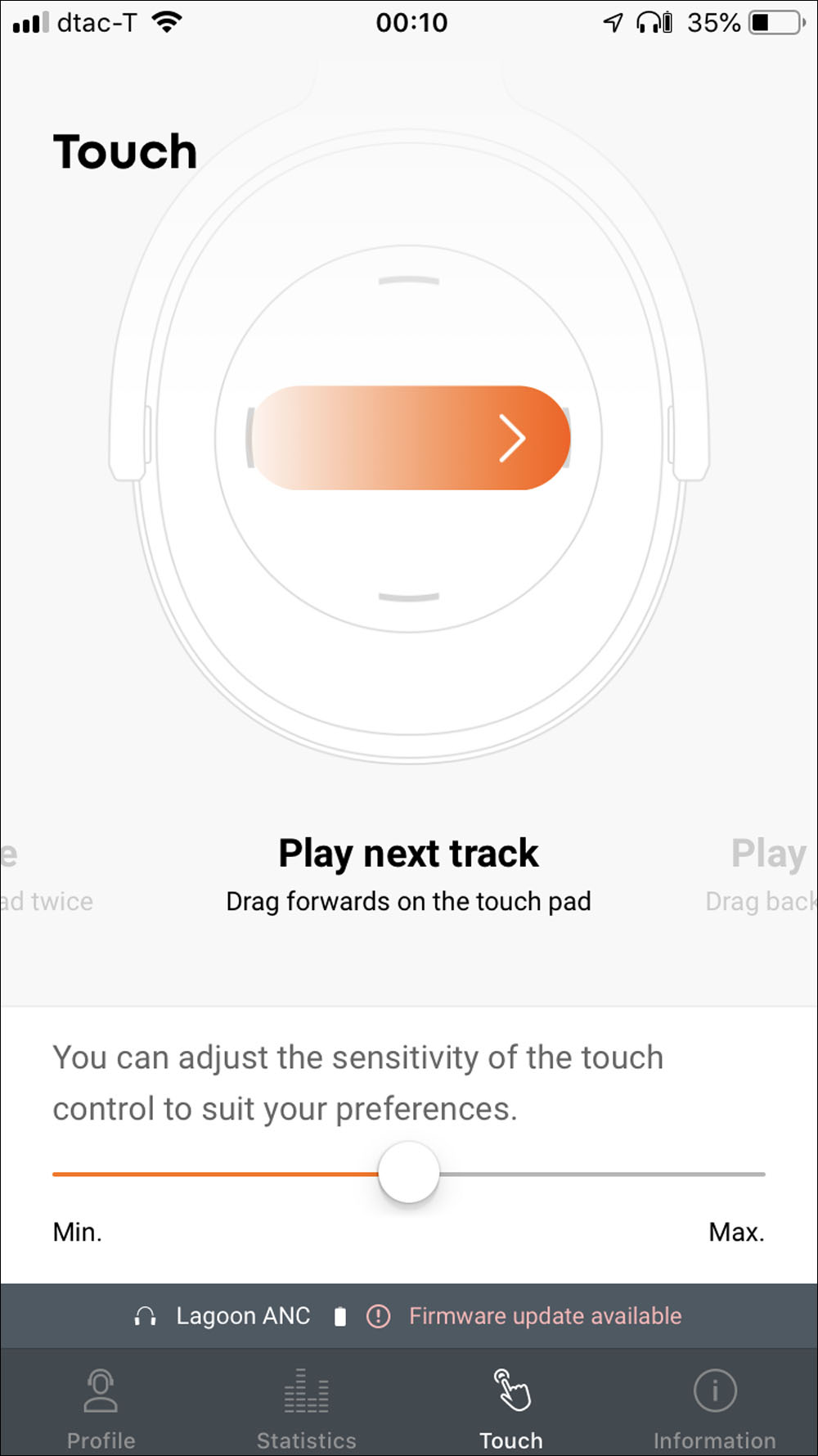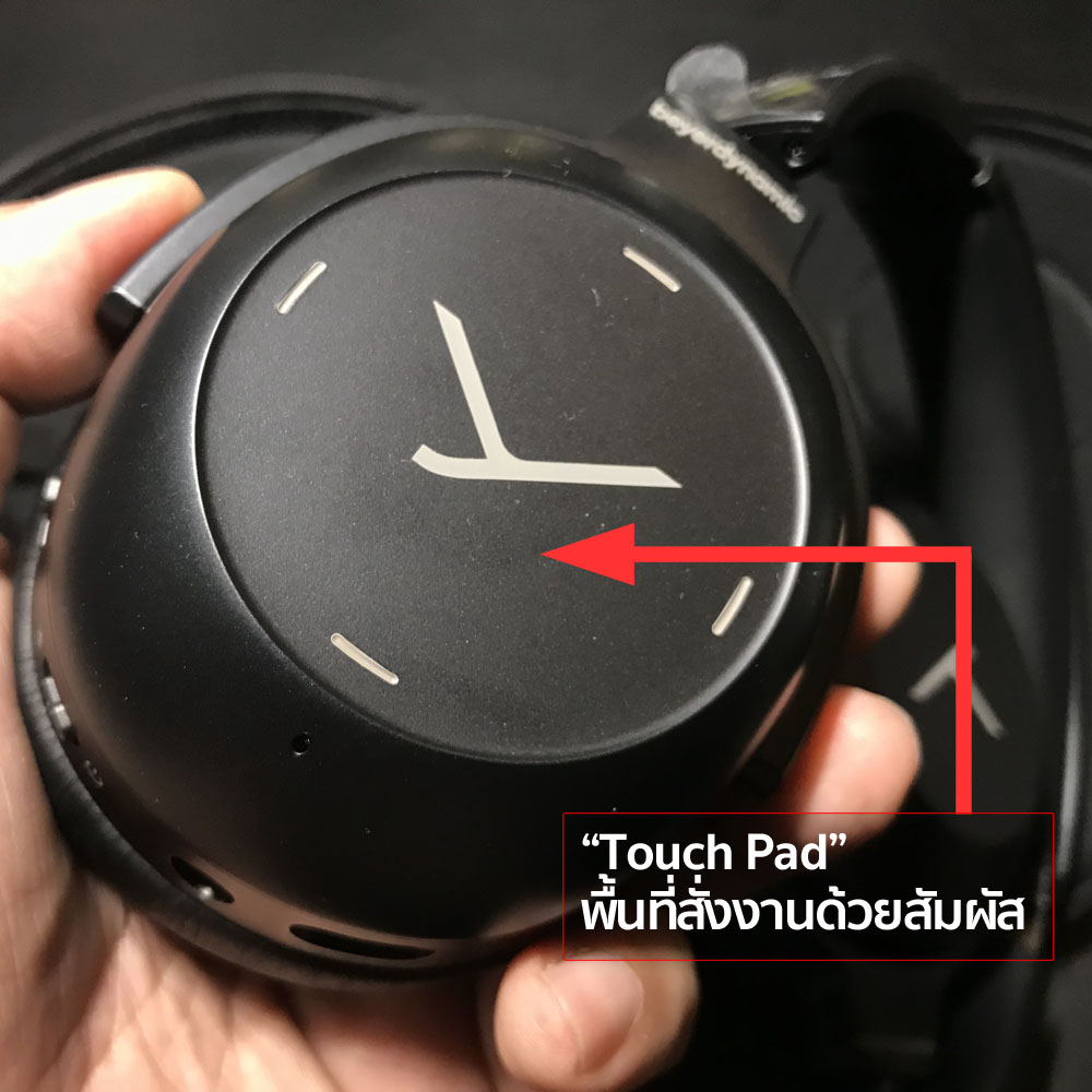 ที่ด้านหลังบอดี้ของหูฟังข้างขวาถูกใช้ให้ทำหน้าที่เป็น touch pad ที่รองรับการสั่งงานด้วยการใช้ปลายนิ้วรูดและเคาะเบาๆ ไปบนพื้นที่บนหลังตัวหูฟังที่เรียกว่า touch pad ที่ว่านั้น สามารถปรับตั้ง “น้ำหนัก” ของปลายนิ้วที่เหมาะสมได้ตามถนัดของคนใช้ ซึ่งคำสั่งหลักๆ ก็คือป้ายปลายนิ้วไปในทิศต่างๆ เพื่อควบคุมการเล่นเพลง อาทิ สั่งเล่น/หยุดเล่น, ข้ามแทรคไปข้างหน้า ด้วยการรูดปลายนิ้วไปข้างหน้า (แบบรูปด้านบน), ถอยกลับไปแทรคก่อนหน้า ด้วยการรูดปลายนิ้วจากด้านหน้าไปด้านหลัง, เพิ่ม/ลดระดับความดัง ด้วยการรูดปลายนิ้วจากล่างขึ้นบน (เพิ่ม) และรูดจากบนลงล่าง (ลด) และใช้เคาะเบาๆ เพื่อรับสายและวางสายโทรศัพท์ เป็นฟังท์ชั่นที่ช่วยอำนวยความสะดวกในการใช้งานได้เยอะมาก