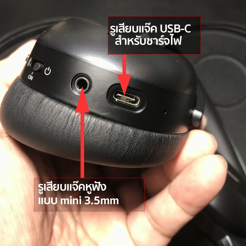 หรือในกรณีที่คุณใช้วิธีป้อนสัญญาณอินพุตให้กับหูฟังทางช่อง mini 3.5mm ก็สามารถใช้งานฟังท์ชั่น ANC ได้ แต่ตัวหูฟังต้องมีแบตฯ นะฟังท์ชั่น ANC ถึงจะทำงาน ซึ่งวิธีชาร์จไฟก็ง่ายๆ คือ ปิดเครื่อง และใช้สาย USB-C เสียบเข้าที่ช่องอินพุต USB-C แล้วสังเกตสีของไฟที่อยู่ด้านในตัวหูฟังซึ่งจะเปลี่ยนสีไปตามเปอร์เซ็นต์ของไฟที่ชาร์จ อย่างเช่น ถ้าไฟเป็นสีแดงกระพริบ แสดงว่าปริมาณไฟในแบตเตอรี่อยู่ในระดับไม่ถึง 30%, ถ้ากระพริบเป็นสีเหลืองแสดงว่ามีปริมาณไฟอยู่ระหว่าง 30 – 70%, ถ้ากระพริบเป็นสีเขียว แสดงว่าปริมาณไฟของแบตเตอรี่อยู่ระหว่าง 70 – 99% และถ้าไฟเปลี่ยนเป็นสีเขียวสว่างค้างคงที่ แสดงว่าชาร์จเต็ม 100% แล้ว