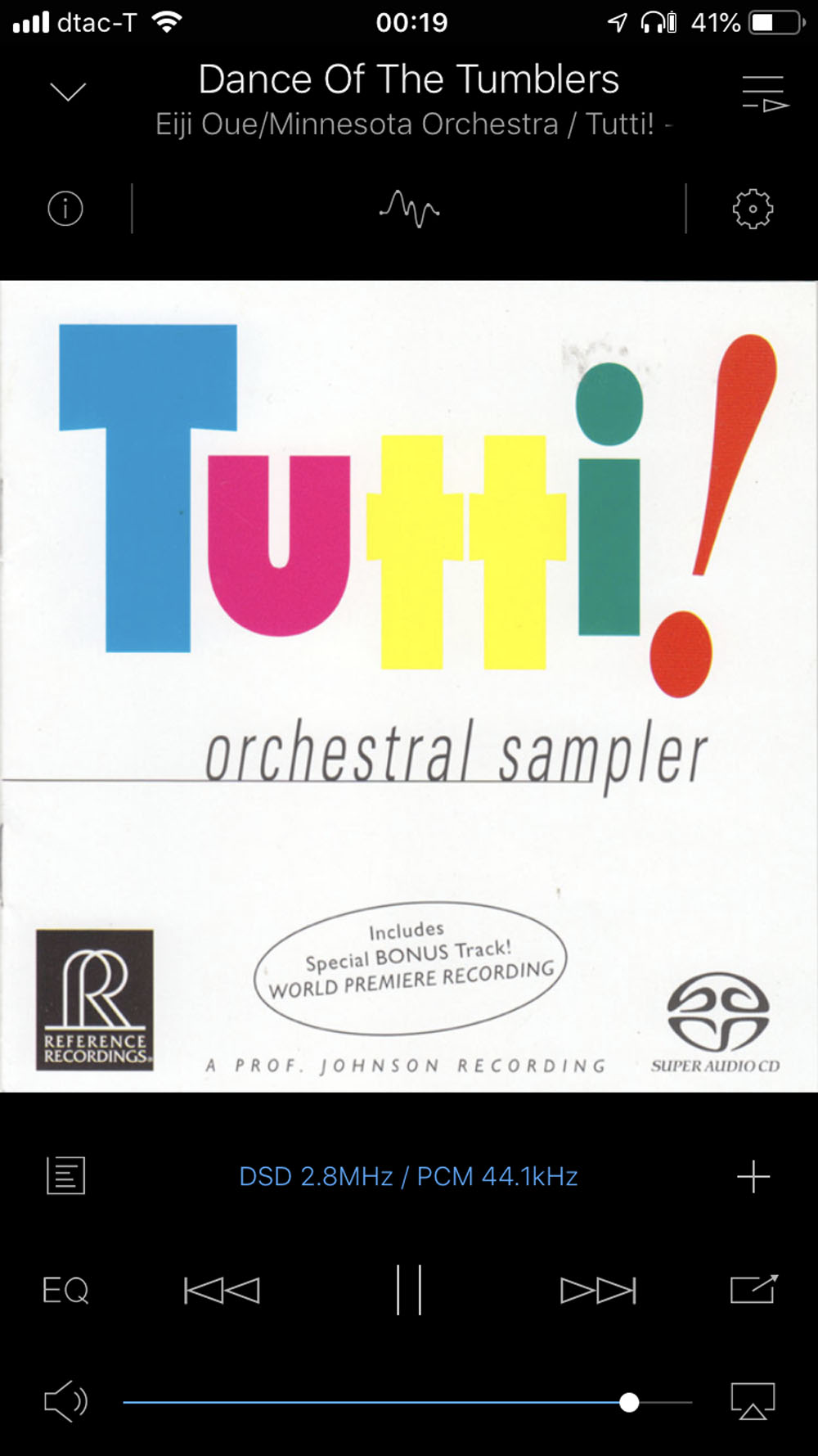 หลังจากฟังเสียงของอัลบั้ม A Night At The Opera ซึ่งเป็นเวอร์ชั่นที่ผมริปจากแผ่น DVD ในเวอร์ชั่นฉลองครบรอบ 30 ปีของอัลบั้มนี้ ซึ่งบันทึกมาเป็นสัญญาณ 24/48 ผมพบว่า แอพลิเคชั่น Onkyo HF Player ที่ใช้เล่นไฟล์เพลงบน iPhone 7 ของผมมันทำการลดรูปสัญญาณ 48kHz ลงมาอยู่ที่ระดับ 44.1kHz ก่อนจะจัดส่งออกไปให้ Lagoon ANC ผ่านคลื่น Bluetooth (เป็นคุณสมบัติเด่นของแอพ Onkyo HF Player อยู่แล้ว) ทำให้ผมอยากลองเล่นไฟล์เพลงตระกูล DSD อย่างพวก DSF64 ดูบ้าง เลยเลือกอัลบั้มรวมเพลงคลาสสิกระดับหัวกะทิของค่าย Reference Recordings (RR) ชุด Tutti! ในเวอร์ชั่น DSD64 ออกมาฟัง แน่นอนว่า Onkyo HF Player ก็ทำการแปลงสัญญาณ DSD64 ให้ลงอยูที่ 44.1kHz ก่อนส่งให้ Lagoon ANC เหมือนกัน เสียงออกมาเต็มกว่า–เนียนกว่า–สะอาดกว่าฟังจากไฟล์ WAV 16/44.1 ขึ้นมาอีกระดับ