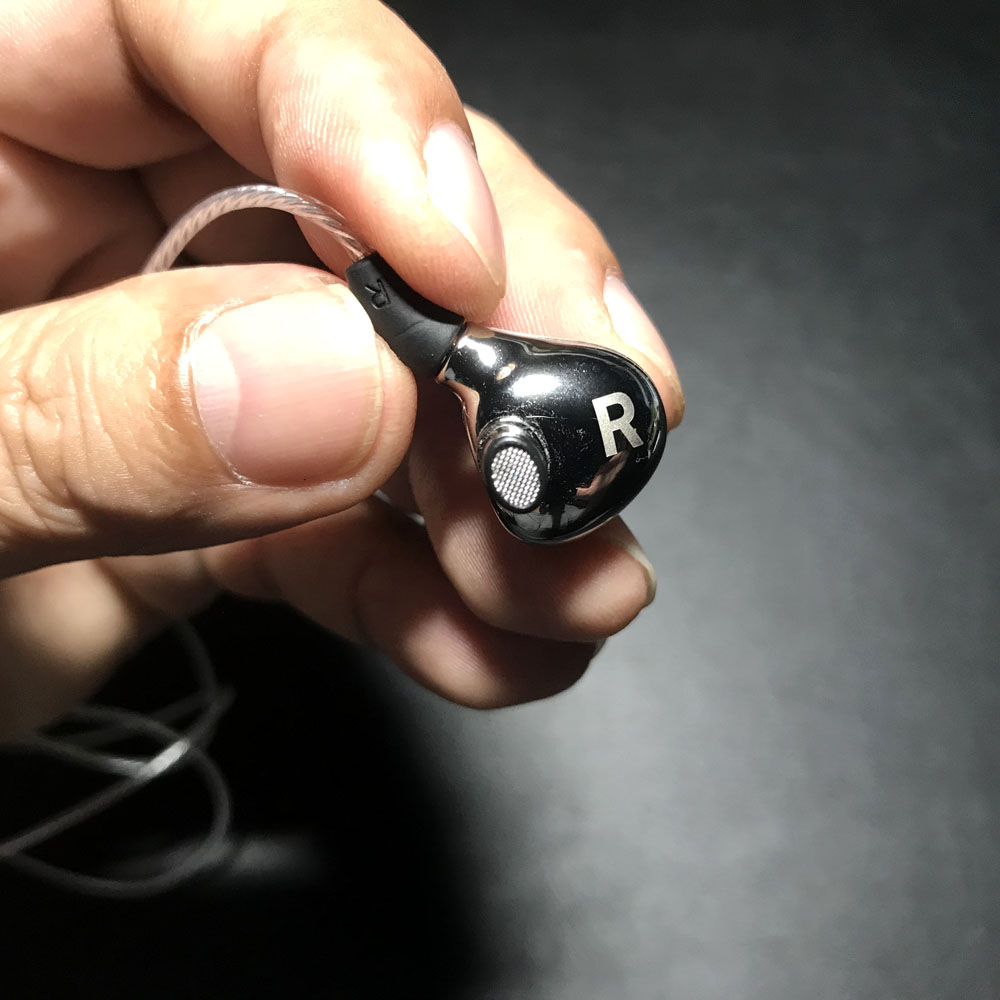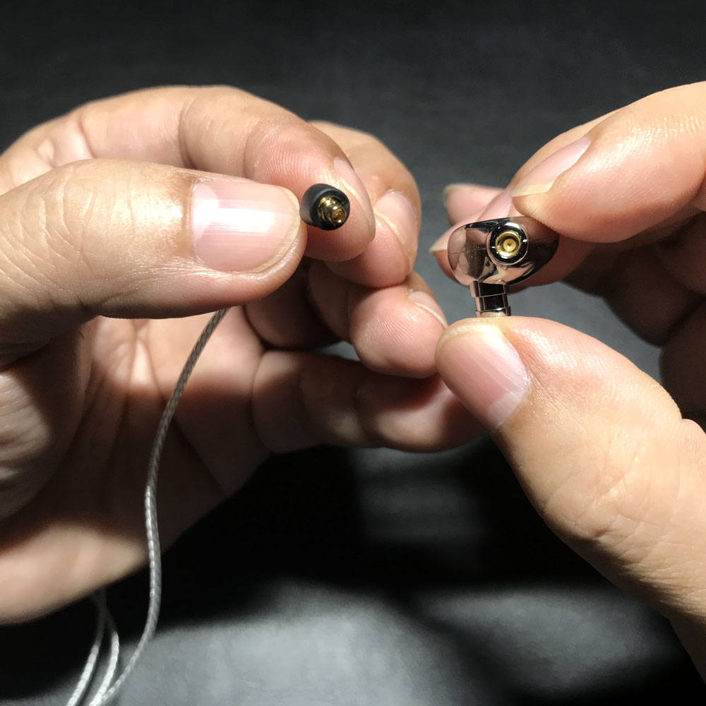 ระหว่างตัวหูฟังกับปลายสายหูฟัง เชื่อมต่อกันด้วยขั้วต่อแบบ MMCX โดยที่ปลายสายด้านที่เสียบกับหูฟัง จะมีตัวอักษรระบุข้างไว้ชัดเจน ต้องใส่ให้ถูกข้างและอยู่ในรูปทรงที่ถูกต้อง เพราะใส่ผิดไม่แค่เสียงออกมาผิดปกติ แต่จะทำให้คล้องหูยากด้วย