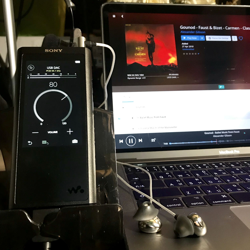 สุดท้าย ผมลองใช้ ZX300 ทำหน้าที่เป็น USB-DAC + Amp ด้วยโหมด USB-DAC ของ ZX300 แล้วใช้โปรแกรม roon เล่นไฟล์เพลงบนคอมพิวเตอร์โน๊ตบุ๊ค MacBook Pro ซึ่งวิธีเล่นแบบนี้จะทำให้ output ของ ZX300 ออกมาแรงกว่าเล่นด้วยโปรแกรมเพลเยอร์ในตัว ZX300 เอง ซึ่งผลลัพธ์ที่ผมได้ยินผ่าน XELENTO REMOTE ออกมาก็ดีกว่าตอนฟังผ่าน DAP ขึ้นไปอีกระดับ สนามเสียงเปิดโล่งมากขึ้น ฉีกตัวลอยห่างศีรษะออกไปมากขึ้น ไดนามิกสวิงได้กว้างขึ้น ทรานเชี้ยนต์เร็วและแรงขึ้นกว่าเดิมขึ้นไปอีก การแยกแยะระหว่างความถี่ดีขึ้นโดยเฉพาะในย่านทุ้ม โทนเสียงออกไปทางสดมากขึ้น ฟังสนุกมากขึ้น เข้าถึงอรรถรสของเพลงที่ฟังได้ลึกลงไปมากขึ้น