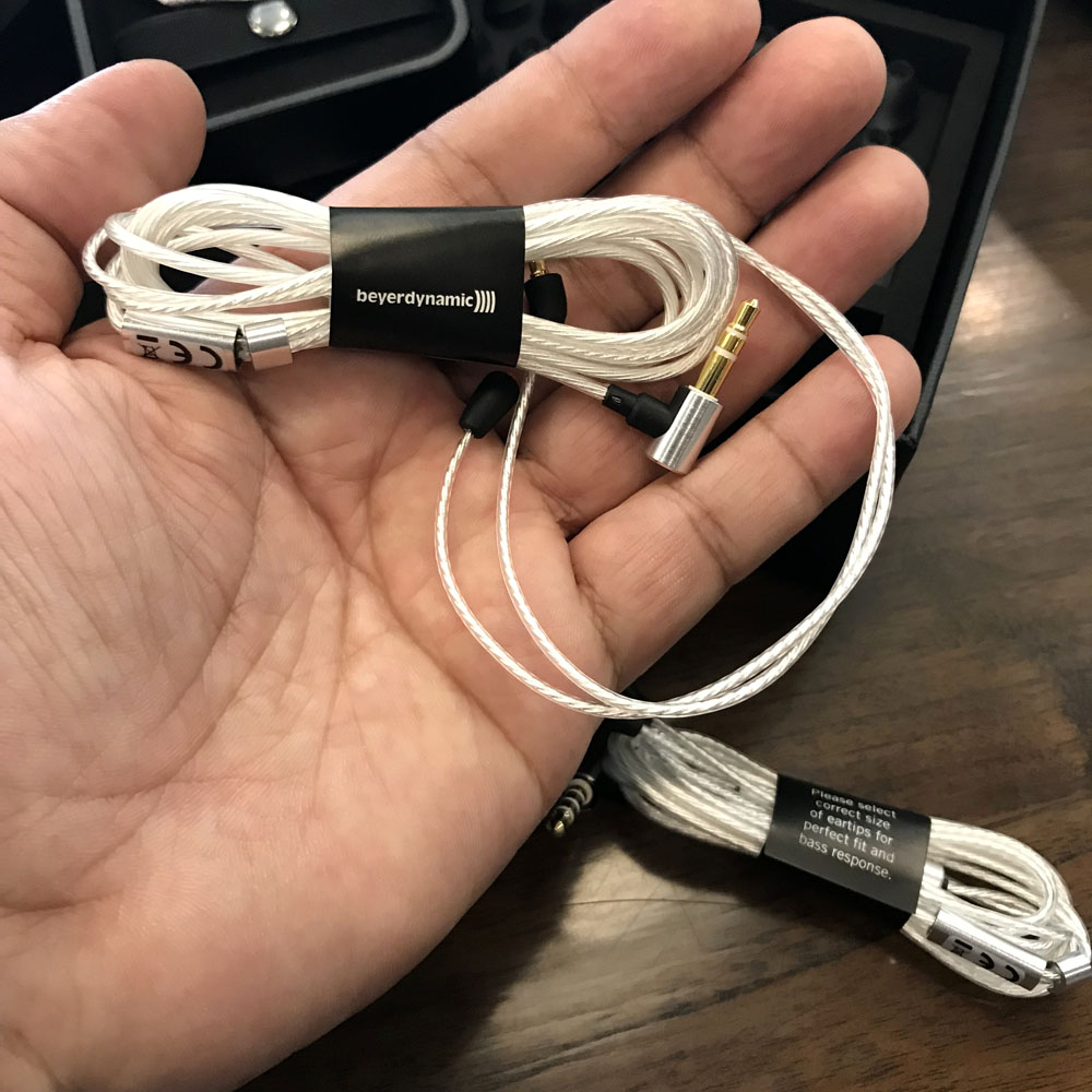 ในกล่องมีสายหูฟังมาให้ 2 เส้น ลักษณะของเส้นตัวนำและส่วนประกอบอื่นๆ เหมือนกันแทบทั้งหมด มีต่างกันอยู่แค่อย่างเดียวคือ เส้นหนึ่งจะมีรีโมทสำหรับรับสายและสั่งงานในการเล่นเพลงติดตั้งมาให้ด้วย ใช้งานได้ทั้งกับสมาร์ทโฟน iOS และ Android ในขณะที่อีกเส้นไม่มี ที่ให้มาสองเส้นก็เพื่อให้เหมาะกับไล้ฟ์สไตล์ของผู้ใช้แต่ละคน หรือเพื่อการเลือกในแต่ละความต้องการนั่นเอง หากคุณเป็นคนที่มีอารมณ์สุนทรีย์ ชอบฟังเพลง แต่ไม่ได้เป็นนักฟังเพลงที่มีความซีเรียสในคุณภาพเสียงแบบสุดติ่ง แค่ต้องการฟังเพลงไปด้วยรับสายโทรฯ ได้ด้วย สายหูฟังแบบที่มีรีโมทติดมาให้ก็เหมาะกับคุณ แต่ถ้าเป็นนักฟังเพลงที่ต้องการคุณภาพระดับที่ดิ่งลึกลงไปถึงอารมณ์เพลงจริงๆ ซึ่งกลุ่มนี้มักจะมีเครื่องเล่นไฟล์เพลง หรือ Digital Audio Player (DAP) คุณภาพสูงอยู่แล้ว สายหูฟังตัวที่ไม่มีรีโมทรับสายโทรศัพท์จะเหมาะมากกว่า เพราะไม่มีอุปกรณ์อิเล็กทรอนิคมาคั่นสัญญาณเสียง ทำให้ได้เสียงที่มีความบริสุทธิ์สูงเท่าเทียมกันทั้งสองข้าง