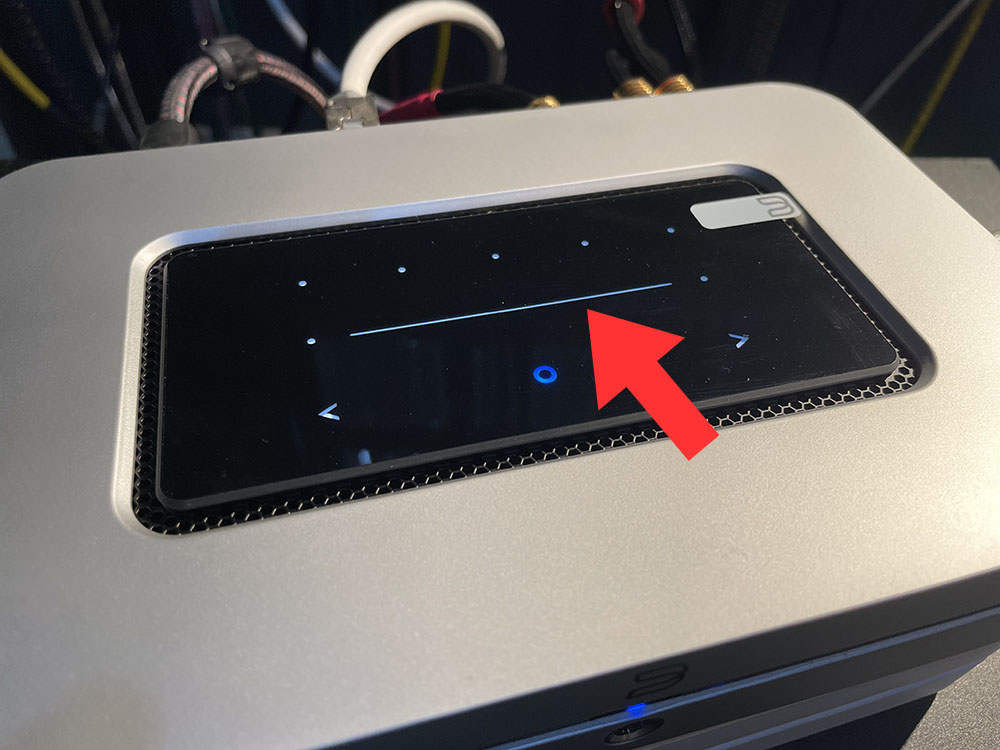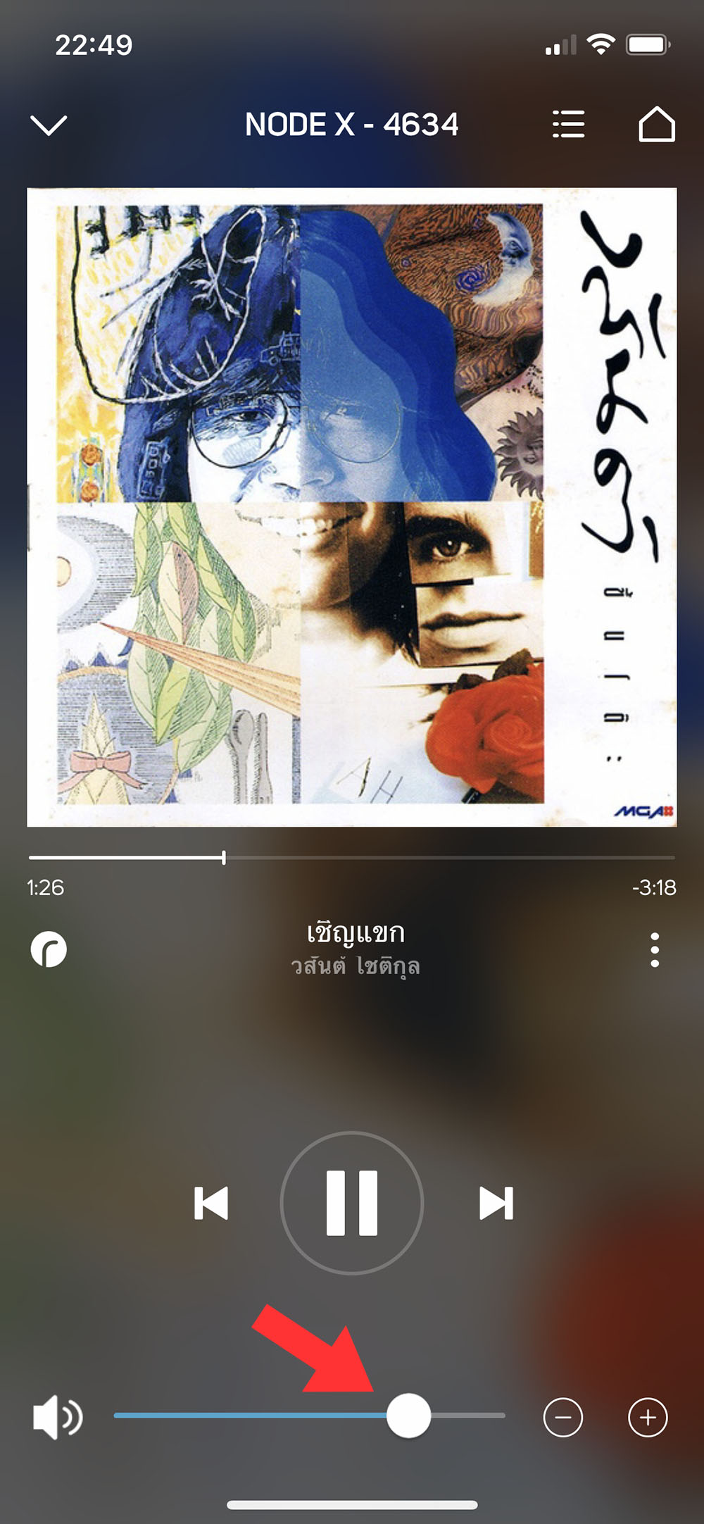 นอกจากนั้น คุณยังสามารถปรับวอลลุ่มผ่านทางแอพลฯ BluOS ได้อีกทางหนึ่ง (ภาพด้านบน) โดยใช้ปลายนิ้วจิ้มที่ปุ่มกลมๆ สีขาวที่ศรชี้แล้วลากซ้าย–ขวาเพื่อปรับความดังได้เลย หรือจะใช้วิธีจิ้มลงไปที่เครื่องหมาย – หรือเครื่องหมาย + ที่อยู่ถัดมาทางขวามือเมื่อต้องการลดหรือเพิ่มความดังก็ได้ ซึ่งผมชอบใช้วิธีจิ้มลงไปที่เครื่องหมายบวก/ลบมากกว่า คุมความดังได่ง่าย สะดวกมาก ..