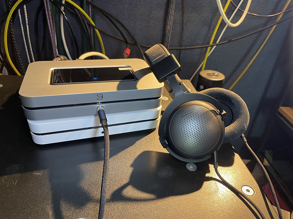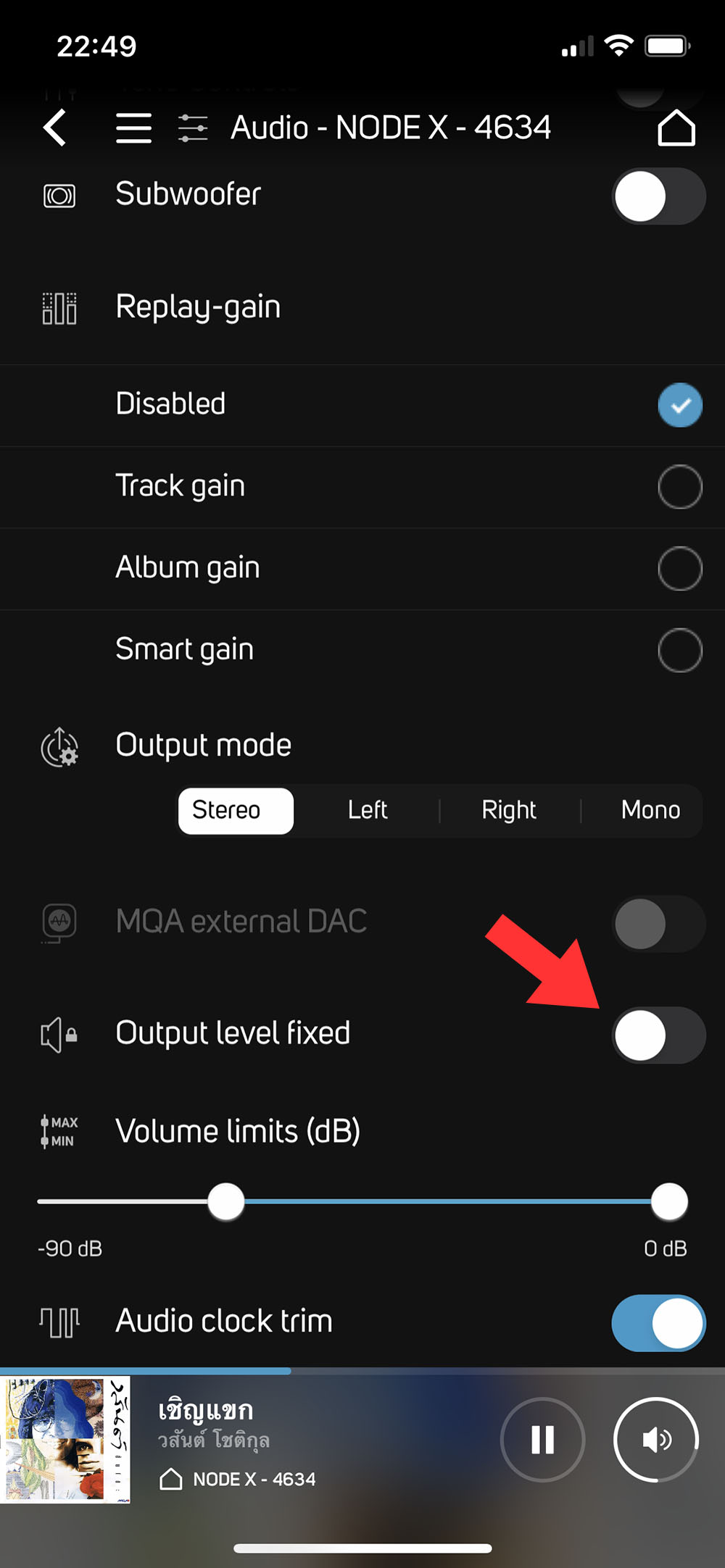 ใครใช้ Bluesound อยู่คงรู้ว่า Bluesound มีแอพลิเคชั่นที่ชื่อว่า BluOS อยู่ ซึ่งออกแบบมาให้ไว้ใช้ควบคุมสั่งงานและปรับตั้งฟังท์ชั่นต่างๆ บนอุปกรณ์ของ Bluesound เป็นแอพฯ ฟรีที่มีให้โหลดมาใช้ได้ครบทุกฟอร์แม็ต ทั้งโมบายและคอมพิวเตอร์ ซึ่งในนั้นมีฟังท์ชั่นหนึ่งที่เกี่ยวข้องกับการใช้งานภาคขยายหูฟังโดยตรง นั่นคือฟังท์ชั่น ‘Output Level Fixed’ (ศรชี้ ภาพข้างบน) ซึ่งก่อนหน้าที่ผมจะเสียบแจ๊คหูฟังเข้าไปที่ช่องเสียบด้านหน้าเครื่อง ผมต่อเอ๊าต์พุตอะนาลอกของ NODE X เข้ากับอินติเกรตแอมป์ LEAK Stereo 230 ขับลำโพง KEF รุ่น R3 Meta อยู่ ซึ่งตอนนั้นผมปรับตั้งฟังท์ชั่น ‘Output Level Fixed’ ไว้ที่ตำแหน่ง ‘On’ คือให้ NODE X ปล่อยสัญญาณอะนาลอก เอ๊าต์พุตออกมาดังสุด โดยที่ผมไปใช้วอลลุ่มของแอมป์ LEAK ในการควบคุมความดัง แต่เมื่อผมเสียบแจ๊คหูฟังเข้าไปที่รูเสียบด้านหน้าเครื่อง ฟังท์ชั่น ‘Output Level Fixed’ จะเปลี่ยนไปอยู่ที่ตำแหน่ง ‘Off’ โดยอัตโนมัติ และที่หัวข้อ ‘Volume Limits (dB)’ ที่อยู่ถัดลงมา จะลดระดับลงมาอยู่ประมาณ 1 ใน 3 ของระดับความดังทั้งหมด นี่คือระบบป้องกันที่ Bluesound ออกแบบไว้ เพื่อไม่ให้เกิดความเสียหายกับหูของผู้ใช้หูฟัง กรณีลืมเปลี่ยนโหมดของสัญญาณอะนาลอก เอ๊าต์พุตตอนจะเปลี่ยนมาฟังหูฟัง