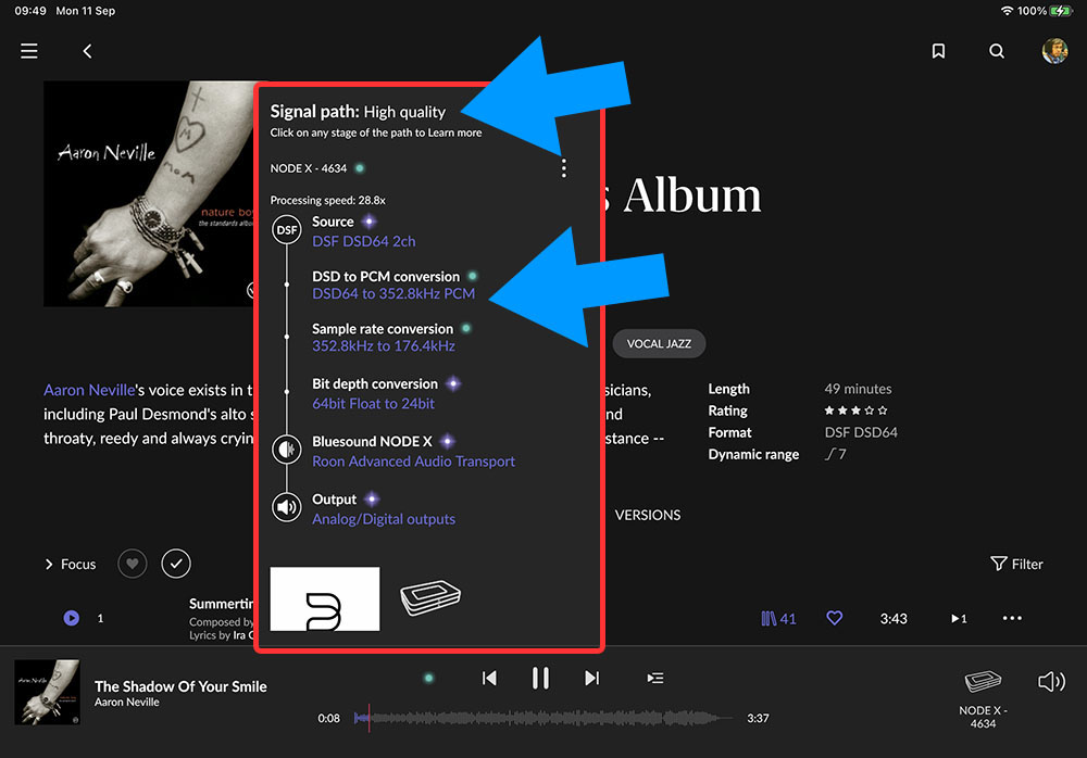 ทางโปรแกรม Roon มีการแยก “ระดับคุณภาพ” ของสัญญาณอะนาลอก เอ๊าต์พุตที่ผ่านกระบวนการทำดิจิตัล คอนเวอร์ชั่นไว้ทั้งหมด 4 ระดับ โดยระบุไว้ในหน้าต่าง ‘Signal Path’ ซึ่งเรียงตามลำดับคุณภาพจาก “ดีที่สุด” ลงไปถึงระดับ “แย่สุด” นั่นคือ Lossless > Enhanced > High Quality > Lossy จะเห็นว่า กระบวนการแปลงสัญญาณ DSD เป็น PCM ที่ Roon ทำให้กับ NODE X ได้คุณภาพเสียงของสัญญาณอะนาลอก เอ๊าต์พุตออกมาในระดับ ‘High Quality’ ในขณะที่ Roon จัดการกับสัญญาณ DSD ให้กับ QB-9 ‘Twenty’ ด้วยวิธี ‘DSD over PCM V1.0 (DoP)’ และระบุระดับคุณภาพของสัญญาณอะนาลอก เอ๊าต์พุตอยู่ที่ ‘Lossless’