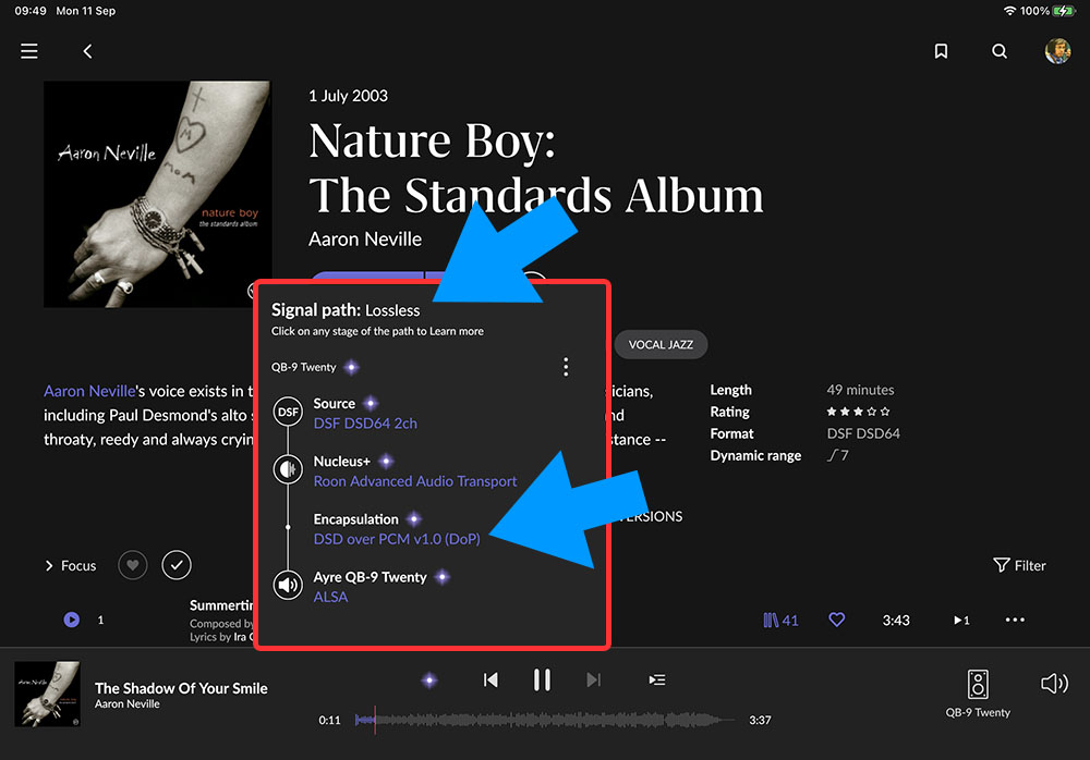 เปรียบเทียบกับตอนเล่นไฟล์เพลง DSF64 ไฟล์เดียวกันผ่าน QB-9 ‘Twenty’ จะเห็นว่า Roon เลือกวิธีการเล่นไฟล์ DSF64 ด้วยกรรมวิธี ‘DSD over PCM v1.0 (DoP)’