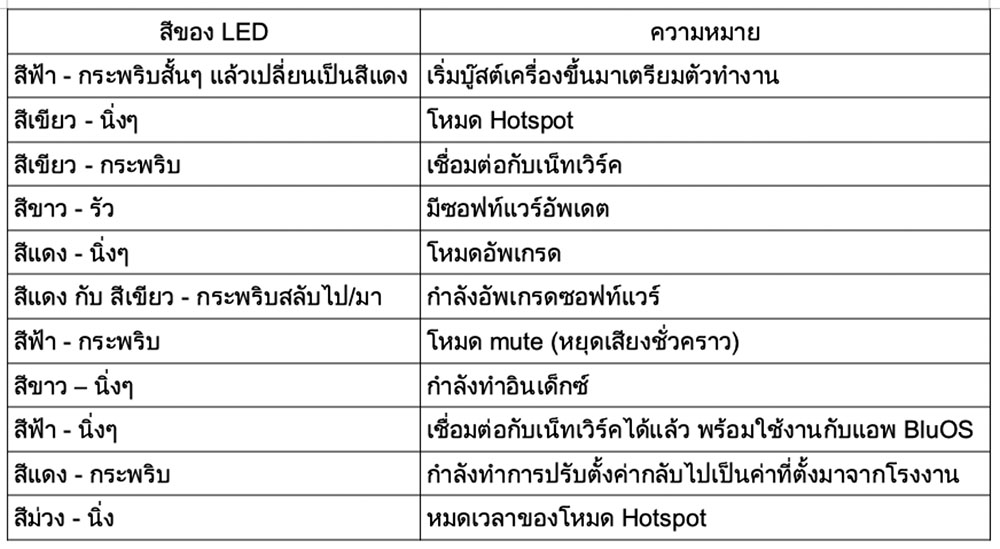 แผงหน้าเครื่องที่สูงแค่ 4.6 ซ.ม. มีเพียงไฟแอลอีดีดวงเล็กๆ ดวงเดียวที่แสดงสถานะการทำงานของตัวเครื่องด้วยการกระพริบเป็นสี หรือสว่างขึ้นมาเป็นสีต่างๆ ที่มีความหมายเหล่านี้