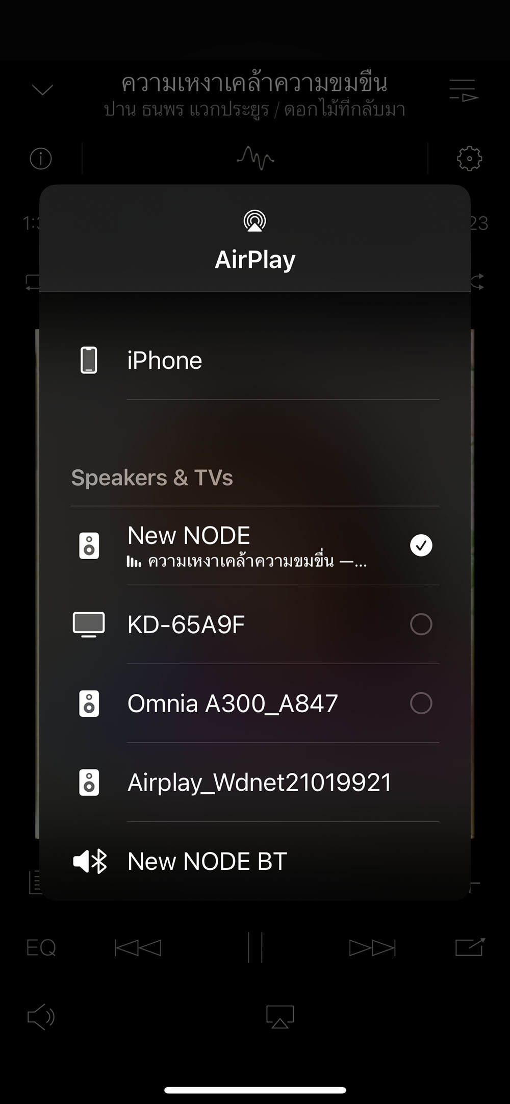 เมื่อใช้อุปกรณ์พกพาที่ทำงานด้วยระบบปฏิบัติการณ์ iOS คุณสามารถสตรีมไฟล์เพลงผ่านระบบไร้สายมาที่ Bluesound NODE ได้ทั้ง 2 ช่องทาง คือผ่านคลื่น WiFi ด้วยเทคโนโลยี AirPlay (ภาพที่สองด้านบน) และผ่านคลื่น Bluetooth (ภาพล่างสุด ด้านบน)