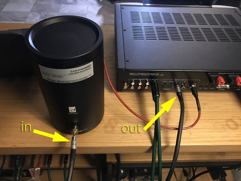 ด้วยจุดประสงค์แรกเริ่มนั้น ทาง Clef Audio ออกแบบเจ้ากระบอก GroundZero ตัวนี้ขึ้นมาเพื่อให้มันทำหน้าที่เป็นเหมือน ถังขยะคอยรองรับไฟฟ้าส่วนเกิน (กราวนด์) ที่ไหลวนอยู่บนอุปกรณ์ในชุดเครื่องเสียง แต่เนื่องจากพื้นฐานของ กราวนด์ก็คือไฟฟ้า ซึ่งแต่ละเครื่องมักจะมีปริมาณของกราวนด์ที่รั่วไหลออกมาไม่เท่ากัน เมื่ออุปกรณ์เครื่องเสียงแต่ละชิ้นถูกเชื่อมโยงเข้าหาด้วยสายสัญญาณ จึงทำให้เกิดการไหลของกราวนด์ไปมาระหว่างตัวเครื่องตามหลักของศักย์ไฟฟ้า ซึ่งจะไหลจากเครื่องที่มีระดับพลังงานไฟฟ้าสูงกว่าไปหาเครื่องที่มีพลังงานไฟฟ้าต่ำกว่า ซึ่งเราไม่อาจล่วงรู้ได้ว่าเครื่องไหนมีกราวนด์รั่วมากน้อยกว่ากัน ถ้าไม่ทำการแยกวัดด้วยเครื่องวัดปริมาณไฟฟ้าซึ่งชาวบ้านทั่วไปก็คงจะไม่มีใครซื้อมาใช้ ดังนั้น วิธีการก็คือ นำเอากระบอก GroundZero ไปเสียบเข้ากับจุดที่เป็นโลหะของตัวเครื่องชิ้นใดชิ้นหนึ่ง โดยใช้สายสัญญาณที่แถมมาให้ เอาด้านที่เป็นแจ๊คบานาน่าเสียบเข้าที่ขั้วเสียบสายลำโพงที่ติดอยู่บนตัวกระบอก GroundZero (ลูกศรชี้คำว่า in ในภาพด้านบน) ส่วนด้านที่เป็นแจ๊ค RCA ตัวผู้ ก็เอาไปเสียบที่ขั้ว RCA ตัวเมียของอุปกรณ์เครื่องเสียงในซิสเต็มนั้น จะเลือกเสียบที่ช่องใดก็ได้ที่เหลือจากการใช้งาน ในภาพด้านบนนั้น ผมทดลองเสียบเข้าที่ช่อง digital input ของอินติเกรตแอมป์ Moon รุ่น 240i ตรงลูกศรสีเหลืองคำว่า out จากนั้นก็ฟังเสียงของซิสเต็มเปรียบเทียบกันดูระหว่างเสียบกระบอก GroundZero กับปลดออก ถ้าชุดเครื่องเสียงของคุณมีไฟฟ้าส่วนเกิน (กราวนด์) ไหลเวียนอยู่ในระบบ เมื่อเอาขั้วต่อ RCA ตัวผู้ของกระบอกกราวนด์ซีโร่ไปเสียบไว้ที่ช่อง RCA ตัวเมียของอุปกรณ์เครื่องเสียงในระบบนั้น ไฟฟ้าส่วนเกิน (กราวนด์) เหล่านั้นก็จะถูกถ่ายเทออกไปที่กระบอก GroundZero นั่นเอง
