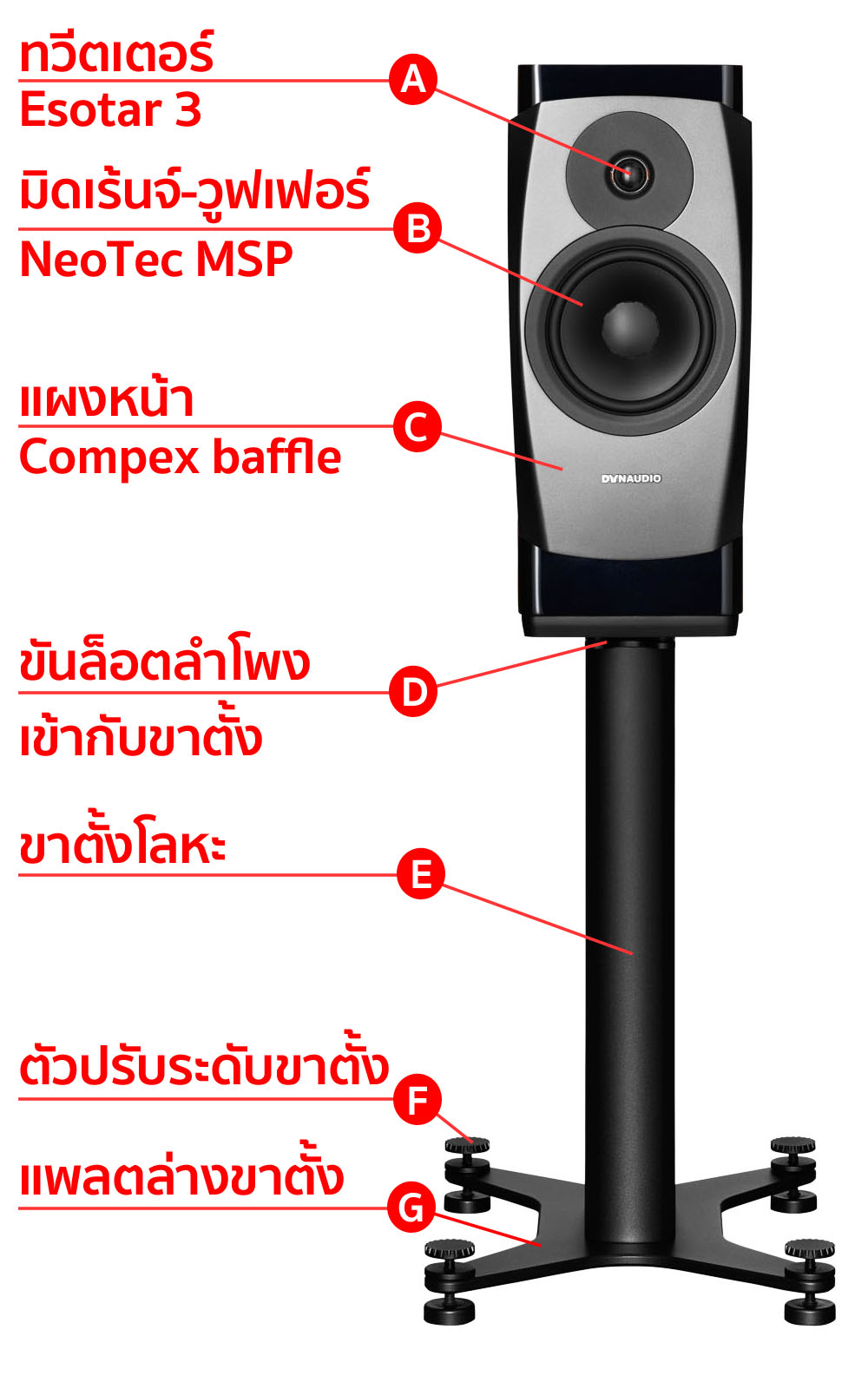 ขาตั้งที่ให้มาพร้อมตัวลำโพง Confidence 20 ทำมาจากโลหะ ลักษณะเป็นท่อโลหะทรงกลมรี มีเจาะรูสำหรับร้อยสายลำโพงจากแผ่นฐานด้านล่างทะลุขึ้นมาโผล่ออกบริเวณกลางๆ ของขาตั้ง ส่วนบนของขาตั้งทำเป็นแพลตที่มีขนาดเล็กกว่าส่วนฐานของตัวลำโพง มีจุดขันน็อต 3 จุด (D) เพื่อยึดส่วนฐานของตัวลำโพงให้ตรึงแน่นเข้ากับตัวขาตั้ง ซึ่งพื้นที่ตรงกลางของแผ่นแพลตบนนี้ถูกทำให้มีลักษณะเป็นแผ่นโค้งมน รับกับรูท่อระบายอากาศที่เจาะอยู่ใต้ฐานของตัวลำโพง (down-firing port) เพื่อยิงมวลอากาศลงด้านล่าง