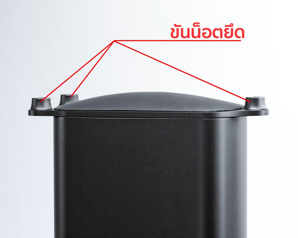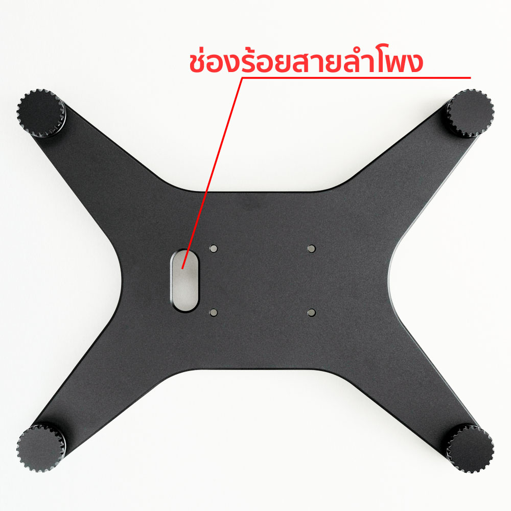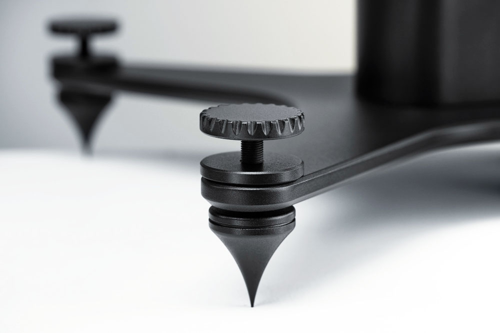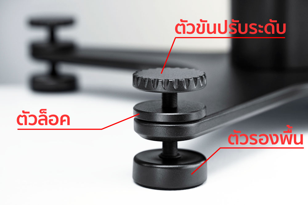 ระบบกลไกที่ใช้ในการปรับระดับสูง–ต่ำในแต่ละแฉกของแผ่นแพลตล่างของขาตั้งออกแบบได้เจ๋งมาก แต่ละจุดใน 4 จุดของขาตั้งแต่ละข้างประกอบด้วยชิ้นส่วนสำคัญ 3 ชิ้น คือ “ตัวขันปรับระดับ” ซึ่งทำจากโลหะเป็นแป้นกลมๆ ขนาดใหญ่ที่เชื่อมต่ออยู่กับแกนเกลียวยาวๆ วิธีปรับระดับก็แค่หมุนแผ่นแป้นของตัวปรับระดับให้ทะลุลงไปด้านล่างของแผ่นแพลตผ่านรูเกลียวบนแผ่นแพลต แล้วสวม “ตัวรองพื้น” เข้าไปที่ส่วนฐานของแท่งเกลียว ซึ่งมีให้เลือก 2 แบบ คือเดือยแหลม สำหรับใช้บนพื้นที่มีความนุ่มอย่างเช่นพื้นที่ปูพรม กับแผ่นแป้นโลหะทรงกลมสำหรับใช้บนพื้นที่มีความแข็ง