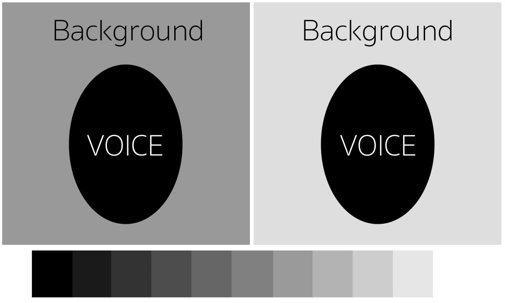 ภาพเปรียบเทียบระดับ contrast dynamic ที่แคบ (ซ้าย) กับกว้าง (ขวา) ซึ่งตัวแปรสำคัญที่ทำให้อัตราคอนทรานส์ไดนามิกของเสียงมีความกว้าง–แคบต่างกันก็คือ noise floor ที่เกิดจากเรโซแนนซ์ของระบบลำโพง จุดใหญ่ๆ ก็คือเรโซแนนซ์ของไดอะแฟรมและตัวตู้นั่นเอง