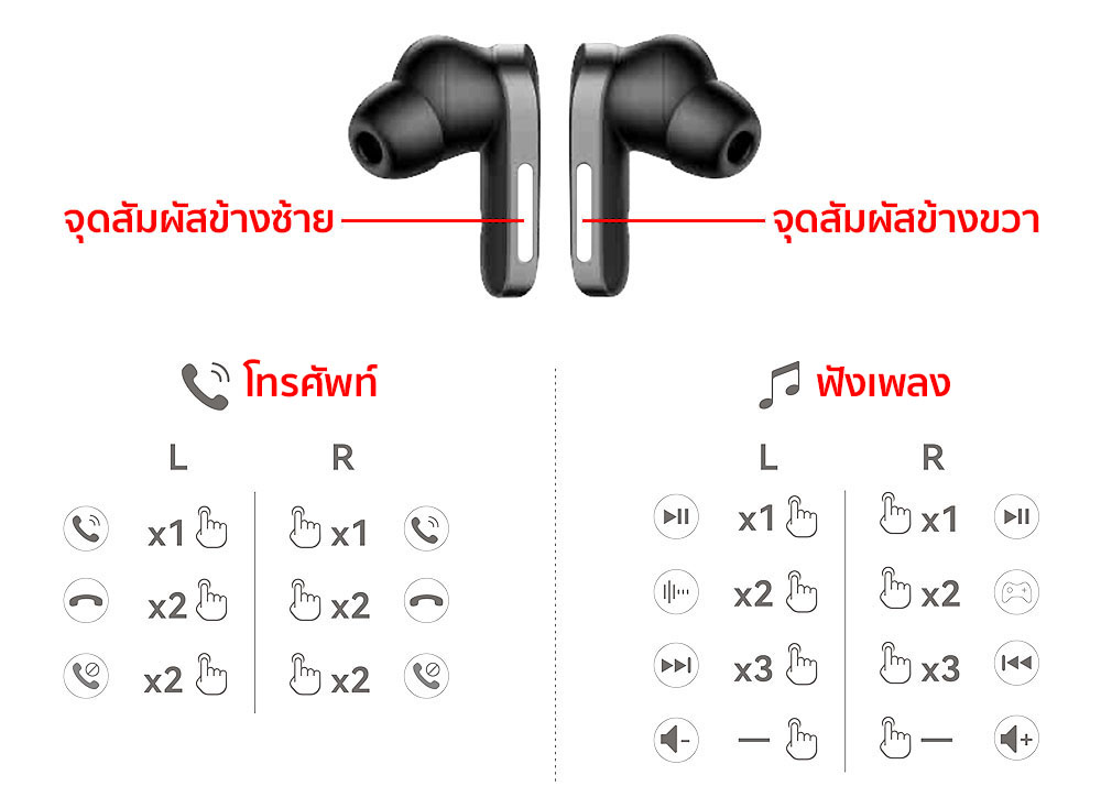 2. Control Settings : ปรับตั้งการทำงานของหูฟังผ่านการแตะที่หูฟังข้างซ้ายและข้างขวา ทั้งที่เป็นการแตะ 2 ครั้ง (Double Press), แตะ 3 ครั้ง (Triple Press) และแตะค้างไว้ (Press and Hold)