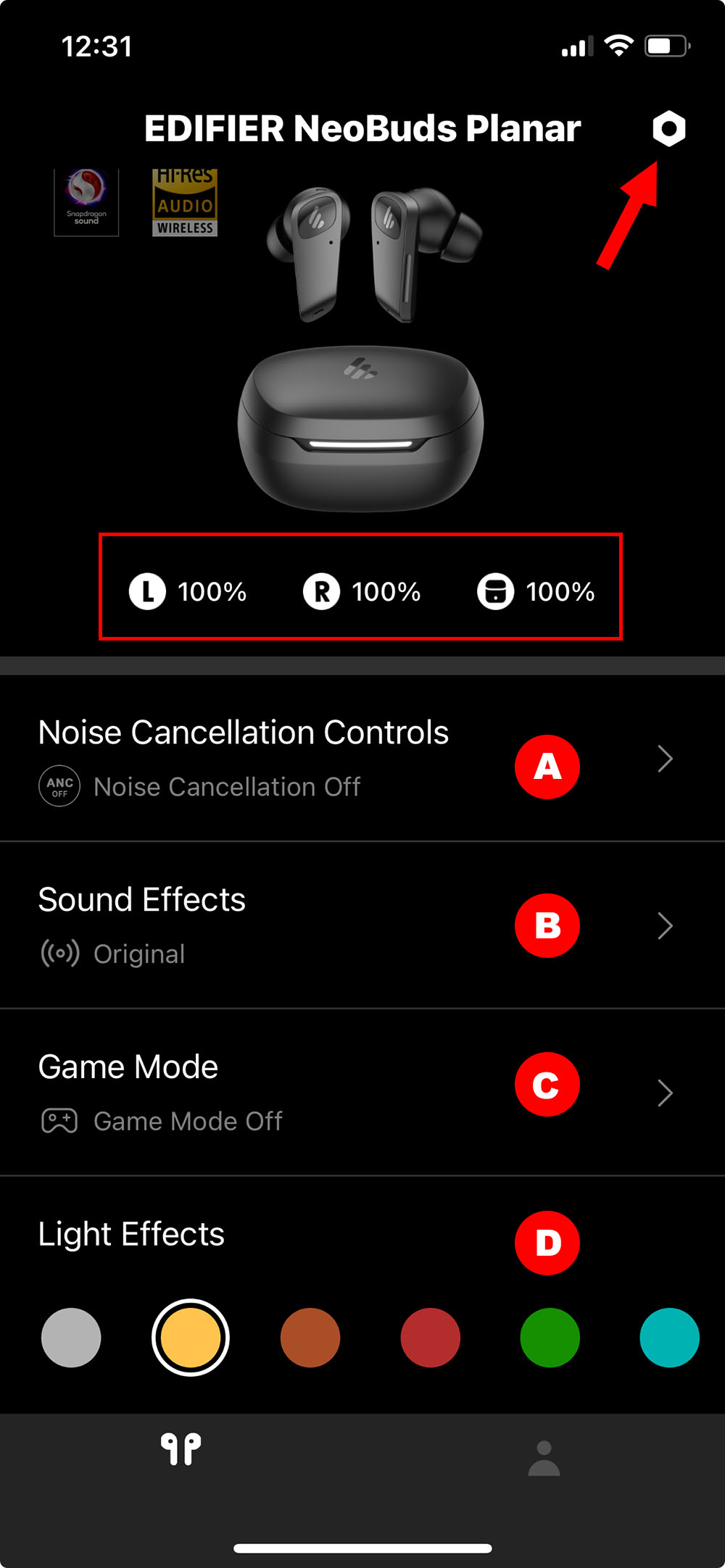 เมื่อติดตั้งเสร็จแล้ว ที่หน้าแรกหรือหน้า Home ของแอพฯ นี้จะมีแจ้งระดับเปอร์เซ็นต์ของแบตเตอรี่ในทั้งหูฟังซ้าย–ขวาและระดับแบตเตอรี่บนตลับเอาไว้ (ในกรอบสีแดง) และมีหัวข้อเมนูย่อยให้เข้าไปทำการปรับตั้งทั้งหมด 4 หัวข้อ คือ