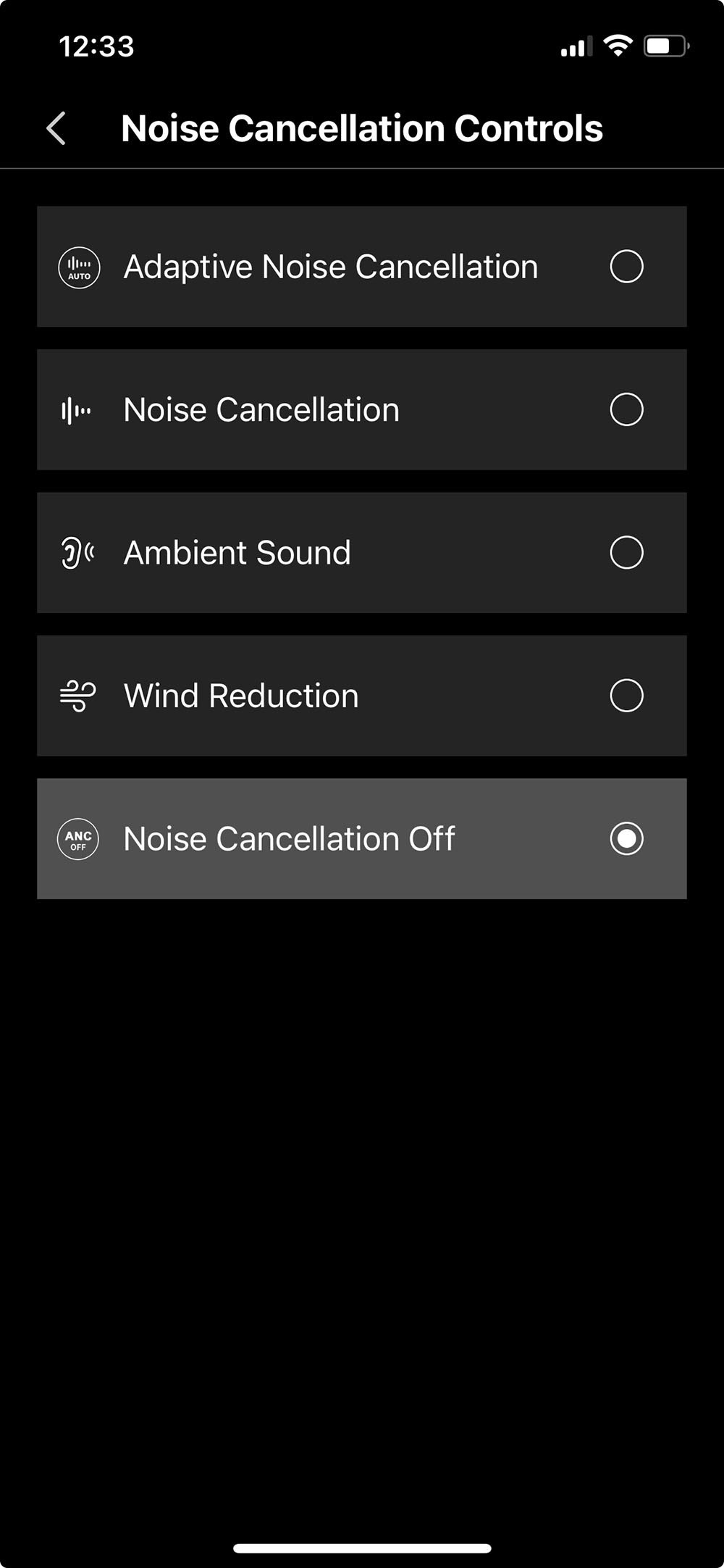 หัวข้อต่อไปคือ Wind Reduction อันนี้เอาไว้ใช้ลดเสียงลมตีเข้าหูฟัง เหมาะกับการเลือกใช้ขณะที่คุณออกไปเดินนอกอาคารและมีลมค่อนข้างแรง สุดท้ายคือ Noise Cancellation Off อันนี้คือปิดการทำงานของฟังท์ชั่น Noise Cancellation ซึ่งเสียงที่ได้ยินในหูก็เหมือนกับเสียงที่ได้ยินหลังจากเสียบตัวหูฟังเข้าไป คือเสียงแวดล้อมจะเบาลงเพราะมีตัวหูฟังอัดอยู่ในรูหู
