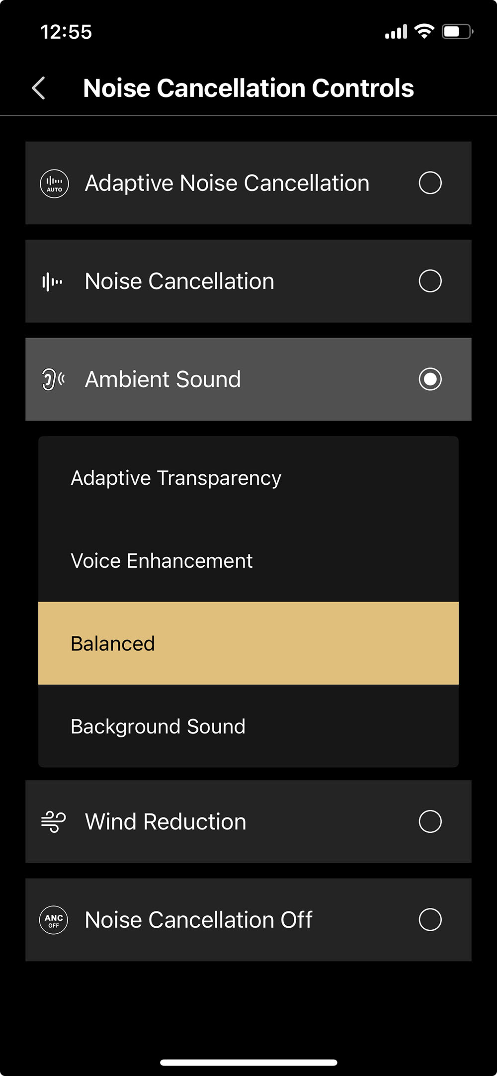 ส่วนอันที่สามคือ Ambient Sound เป็นหัวข้อที่เปิิดโอกาสให้คุณทำการปรับตั้งรูปแบบของการรับฟังเสียงแวดล้อมแบบไม่ต้องถอดหูฟังออก ซึ่งมีเงื่อนไข หรืออ๊อปชั่นให้เลือก 4 รูปแบบ คือ Adaptive Transparency เป็นรูปแบบที่ปรับระดับเสียงแวดล้อมที่เข้ามาในหูฟังแบบไม่ตายตัว ขึ้นอยู่กับสภาพเสียงแวดล้อมในสถานที่นั้นๆ อ๊อปชั่นที่สองคือ Voice Enhancement อันนี้จะเน้นทำให้ได้ยินเสียงพูดของคนที่ชัดเจนมากขึ้น เหมาะเลือกใช้กรณีที่ต้องมีการพูดคุยกับคนภายนอกโดยไม่ต้องถอดหูฟัง หัวข้อที่สามคือ Balanced จะปรับให้ได้ยินเสียงภายนอกในแต่ละความถี่ที่ใกล้เคียงกัน ส่วนอันสุดท้ายคือ Background Sound ดูเหมือนว่าเสียงแวดล้อมจะถูกทำให้ดังมากขึ้นหน่อย แต่ก็ยังไม่ดังเท่ากับถอดหูฟัง