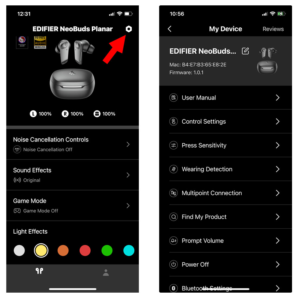 นอกจากนั้น ยังมีการปรับตั้งการทำงานของหูฟัง NeoBuds Planar อีกหลายอย่างที่ถูกเก็บรวบรวมอยู่ในหัวข้อเมนู Settings โดยมีทางเข้าอยู่ที่รูปเฟืองตรงมุมขวาบนของหน้าโฮม (ตำแหน่งศรชี้ภาพซ้าย) ซึ่งหลังจากแตะลงไปบนรูปเฟืองนี้แล้ว หน้าแอพฯ จะเปลี่ยนไปเป็นภาพทางขวา ซึ่งแสดงหัวข้อที่ให้คุณเข้าไปปรับตั้งได้ เรียงกันลงไปทั้งหมด 10 หัวข้อ ดังนี้