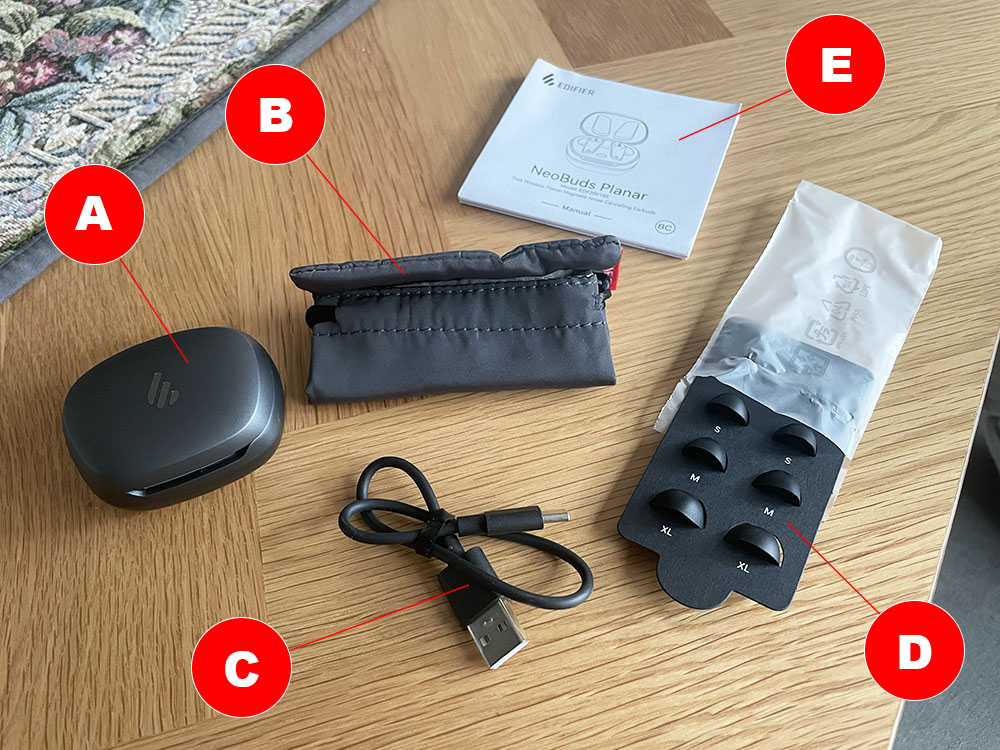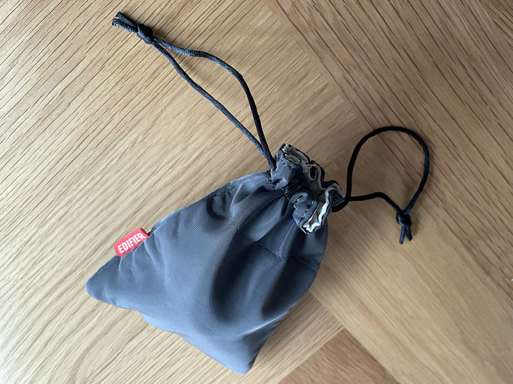 ในกล่องมีตลับหูฟังพร้อมอุปกรณ์อื่นๆ รวมกันทั้งหมด 5 ชิ้น ผมชอบถุงผ้าที่เขาให้มา เป็นถุงผ้าสีเทาเข้ม เข้ากับตัวตลับของหูฟัง กรุด้านในด้วยผ้านุ่มสีครีมอีกชั้น มีสายรัด ดูสวยงามและใช้งานได้ดี..