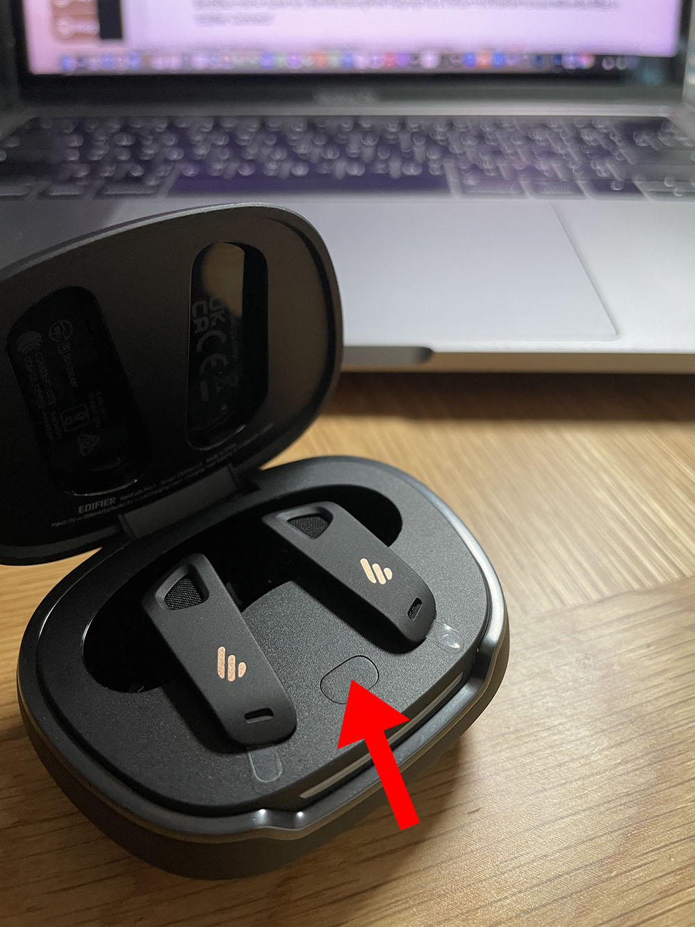 ขั้นตอนแรกก่อนจะเริ่มต้นใช้งานหูฟังตัวนี้ คุณต้องทำการเชื่อมต่อหูฟังตัวนี้เข้ากับอุปกรณ์พกพาหรือสมาร์ทโฟนที่คุณต้องการใช้งานร่วมกันซะก่อน โดยเปิดฝาตลับหูฟังขึ้นมาแล้วใช้ปลายนิ้วกดลงไปตรงตำแหน่งที่ศรชี้ค้างไว้จนแถบไฟด้านหน้าตลับวิ่งไป–มา