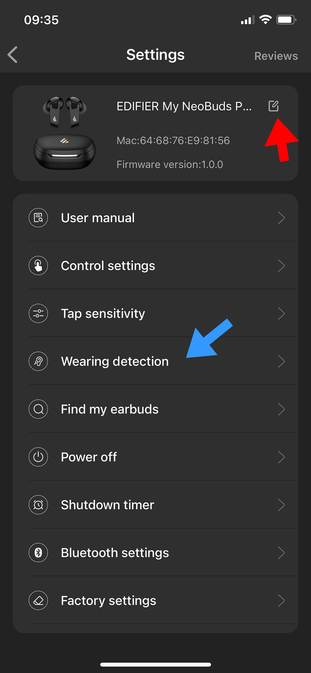 ในเมนูหลัก ‘Settings’ จะมีฟังท์ชั่นให้คุณใช้งานอยู่ทั้งหมด 10 รายการ หลักๆ ก็เป็นการปรับตั้งอ๊อปชั่นต่างๆ สำหรับการทำงานของหูฟัง กับเป็นแหล่งข้อมูล อย่างเช่น เปลี่ยนชื่อหูฟัง (Rename – ศรชี้สีแดง), เข้าไปดูวิธีใช้งาน (User manual), ปรับตั้งความไวในการรองรับคำสั่งด้วยการเคาะแตะลงบนหูฟัง (Tap sensitivity), Wearing detection (ดูรายละเอียดด้านล่าง), ยิงสัญญาณไปที่หูฟัง กรณีที่ลืมวางไว้แล้วหาไม่เจอ (Find my earbuds), สั่งปิดการทำงานของหูฟังโดยที่ยังไม่ได้ใส่ลงตลับ (Power off), ตั้งเวลาปิดการทำงานของหูฟังอัตโนมัติ (Shutdown timer), สั่งตัดการเชื่อมต่อระหว่างหูฟังกับอุปกรณ์ หรือสั่งให้ทำการเชื่อมต่อใหม่ (Bluetooth settings)