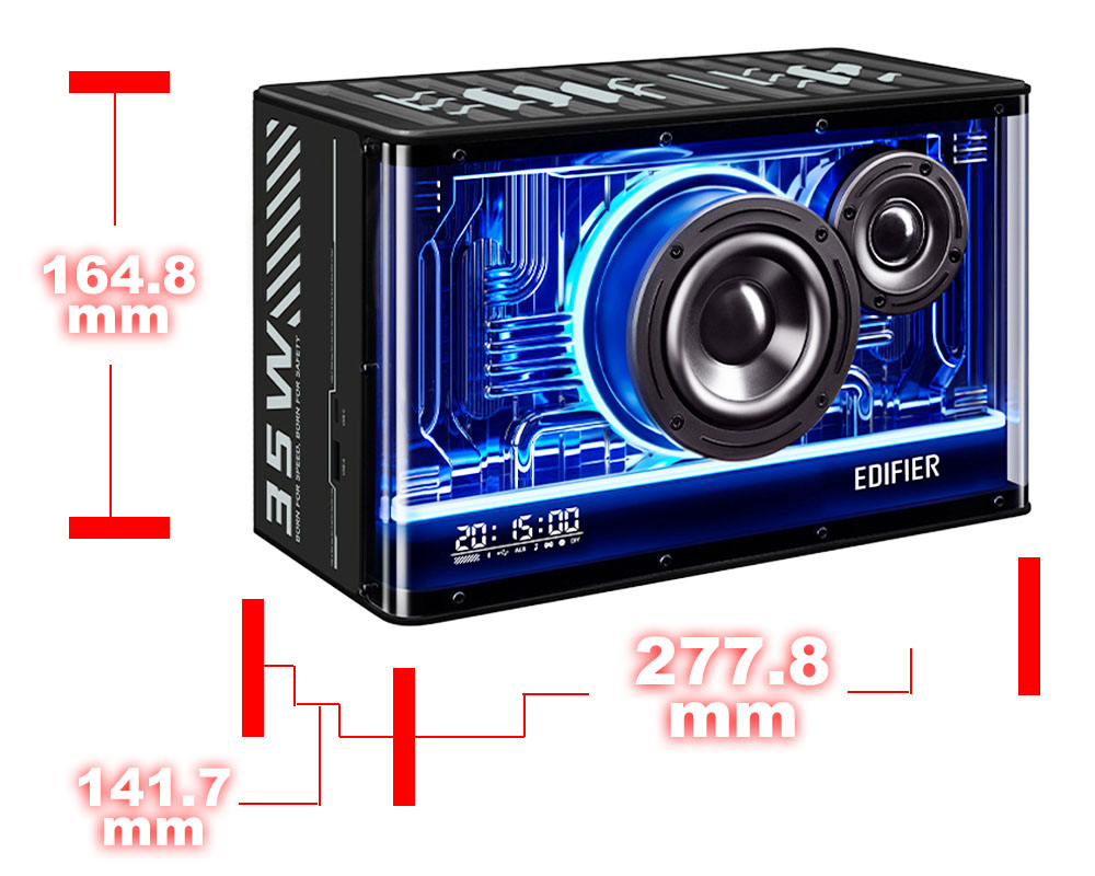 ใครจะชอบหรือไม่ชอบไม่รู้นะ แต่ส่วนตัวผมชอบหน้าตาของลำโพงบลูทูธตัวนี้มาก มันออกแนวเท่ๆ แมนๆ ขรึมๆ เข้าข่ายอินดัสเตี้ยนดีไซน์นิดๆ แผงหน้าโชว์ดอกลำโพงทั้งสองดอกโทนโท่แบบไม่มีอะไรกั้น วัสดุปิดแผงหน้าเป็นพีวีซีใสๆ มองทะลุเข้าไปเห็นด้านในที่ทำเป็นลวดลายโมเดลคล้ายแผงวงจรอิเล็กทรอนิค มีไฟ LED เดินเป็นเส้น ดูแล้วให้ฟิลลิ่งเหมือนหนังอวกาศสตาร์ เทรค ส่วนตัวตู้ด้านนอกออกทรงสี่เหลี่ยม ด้านบนทำเป็นลายร่องๆ มองผิวเผินคล้ายตู้คอนเทนเนอร์ (มีสองสีคือตู้สีดำกับตู้สีขาว)