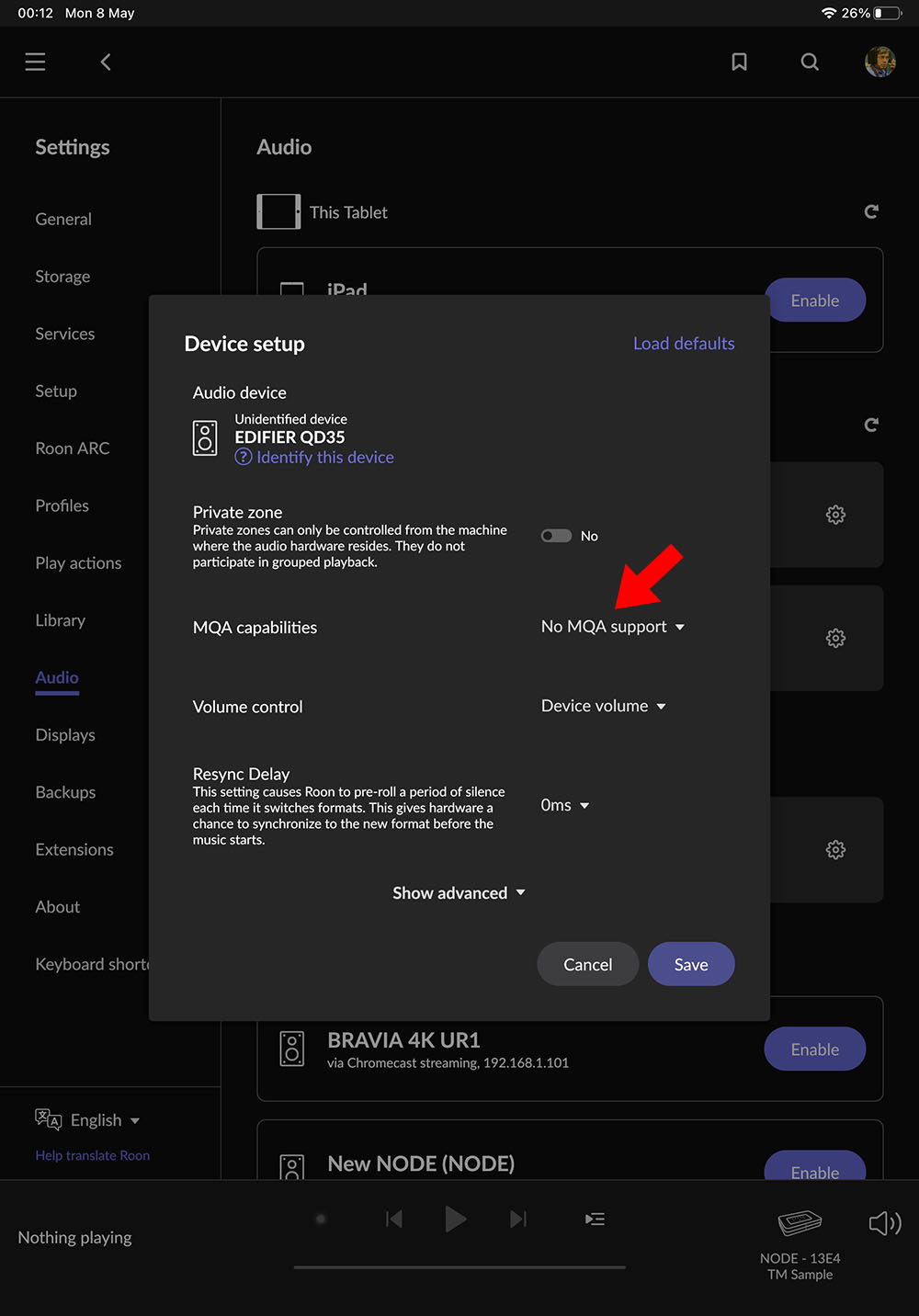 หลังจากเชื่อมต่อช่องอินพุต USB-A ของ QD35 เข้ากับเอ๊าต์พุต USB-A ของ nucleus+ ได้แล้ว ผมก็ลองเข้าไปตรวจเช็คคุณสมบัติของภาค DAC ในตัว QD35 ผ่านทางหัวข้อเมนูที่ชื่อว่า ‘Audio’ ของโปรแกรม Roon (สองภาพข้างบน) ทำให้ผมทราบว่า ข้อที่หนึ่ง – ภาค DAC ในตัว QD35 ไม่มีดีโค๊ดเดอร์ MQA, ข้อที่สอง – ภาค DAC ในตัว QD35 รองรับสัญญาณไฮเรซฯ ฟอร์แม็ต PCM ได้สูงสุดที่ระดับ 24bit / 96kHz ส่วนความสามารถในการรองรับสัญญาณ DSD ไม่ได้แจ้งไว้ (โดยปกติแล้วถ้าไม่ได้แจ้งไว้ก็คือเล่นไม่ได้)