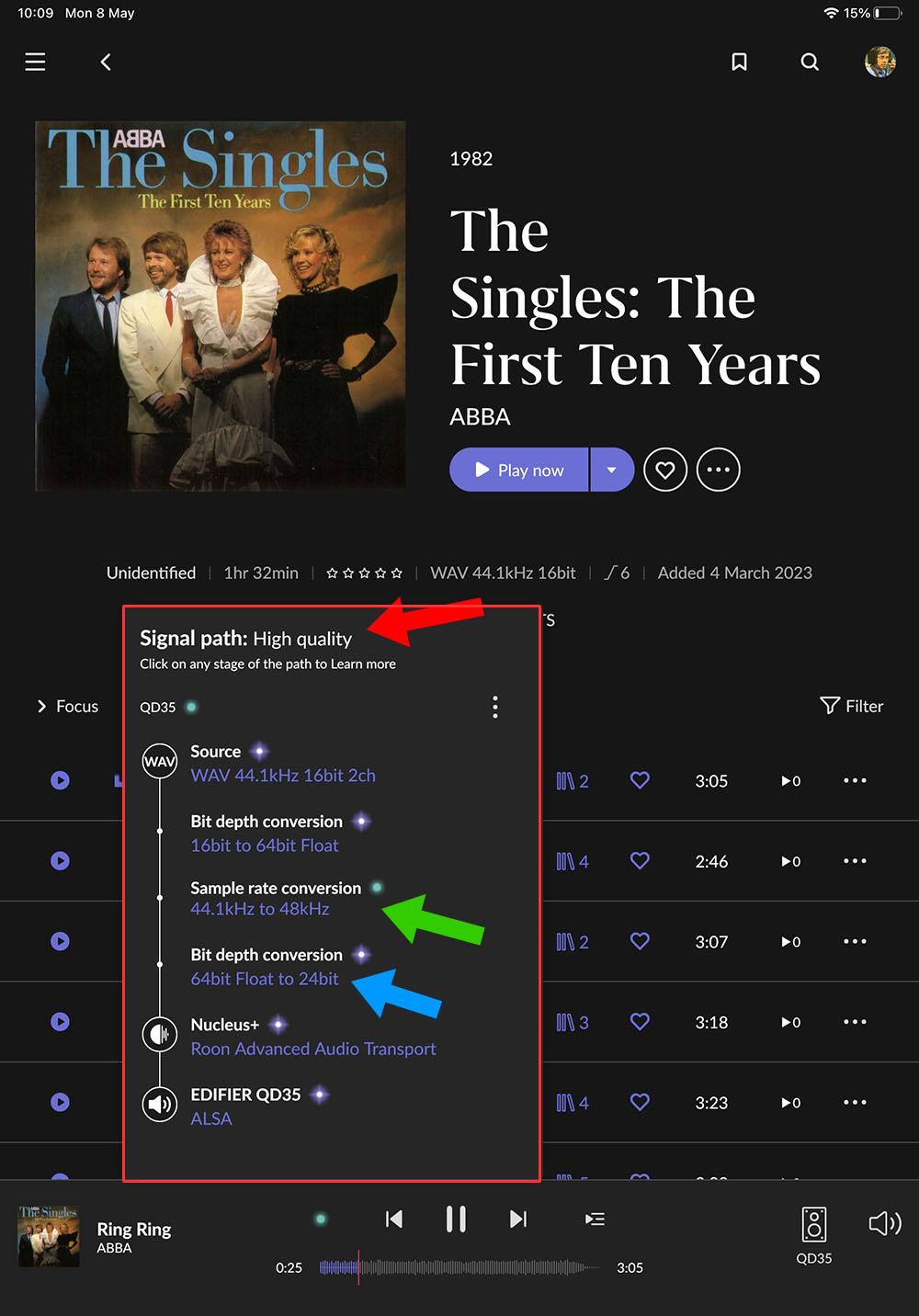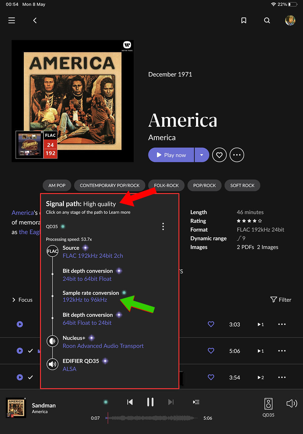 ผมเริ่มด้วยการเล่นไฟล์ที่มีความละเอียดสูงสุดสำหรับมาตรฐาน Hi-Res Audio ที่เป็นฟอร์แม็ต PCM ซึ่งเท่ากับ 24/192 ผมพบว่า ภาค DAC ในตัว QD35 ไม่รองรับสัญญาณที่ระดับ 24/192 เข้าไปตรงๆ โปรแกรม roon จึงต้องทำการแปลง sample rate conversion (ศรชี้สีเขียว) เพื่อลดจาก 192kHz ลงมาเหลือ 96kHz ก่อนจะป้อนออกไปให้อินพุต USB-A ของ QD35 (*สังเกตตรง signal path ของโปรแกรม Roon ที่ศรชี้สีแดงจะแสดงคุณภาพของสัญญาณเอ๊าต์พุตที่ส่งออกไปจากโปรแกรม Roon ว่าอยู่ในระดับ ‘High quality’ เดี๋ยวผมจะอธิบายเพิ่มเติมตรงจุดนี้อีกที)