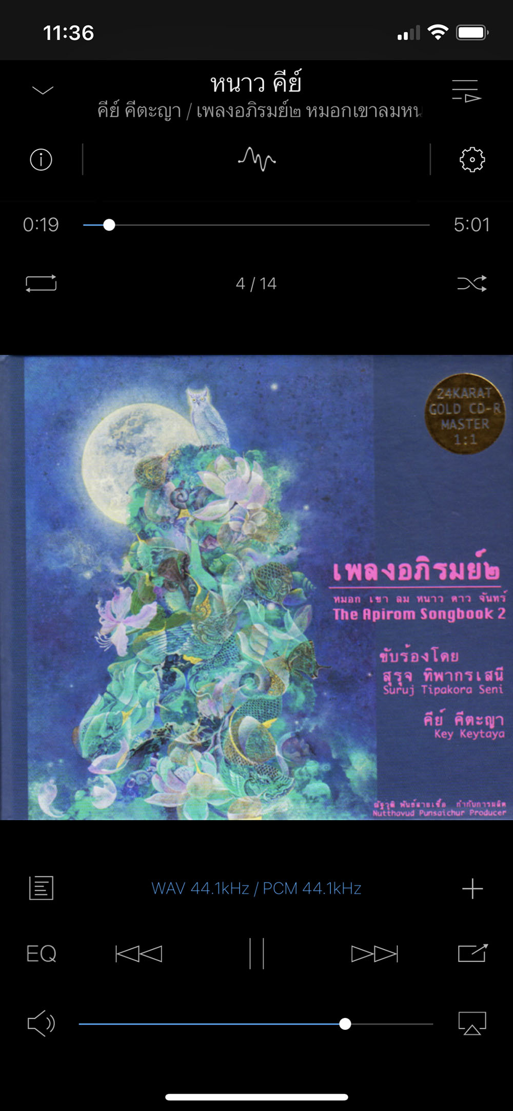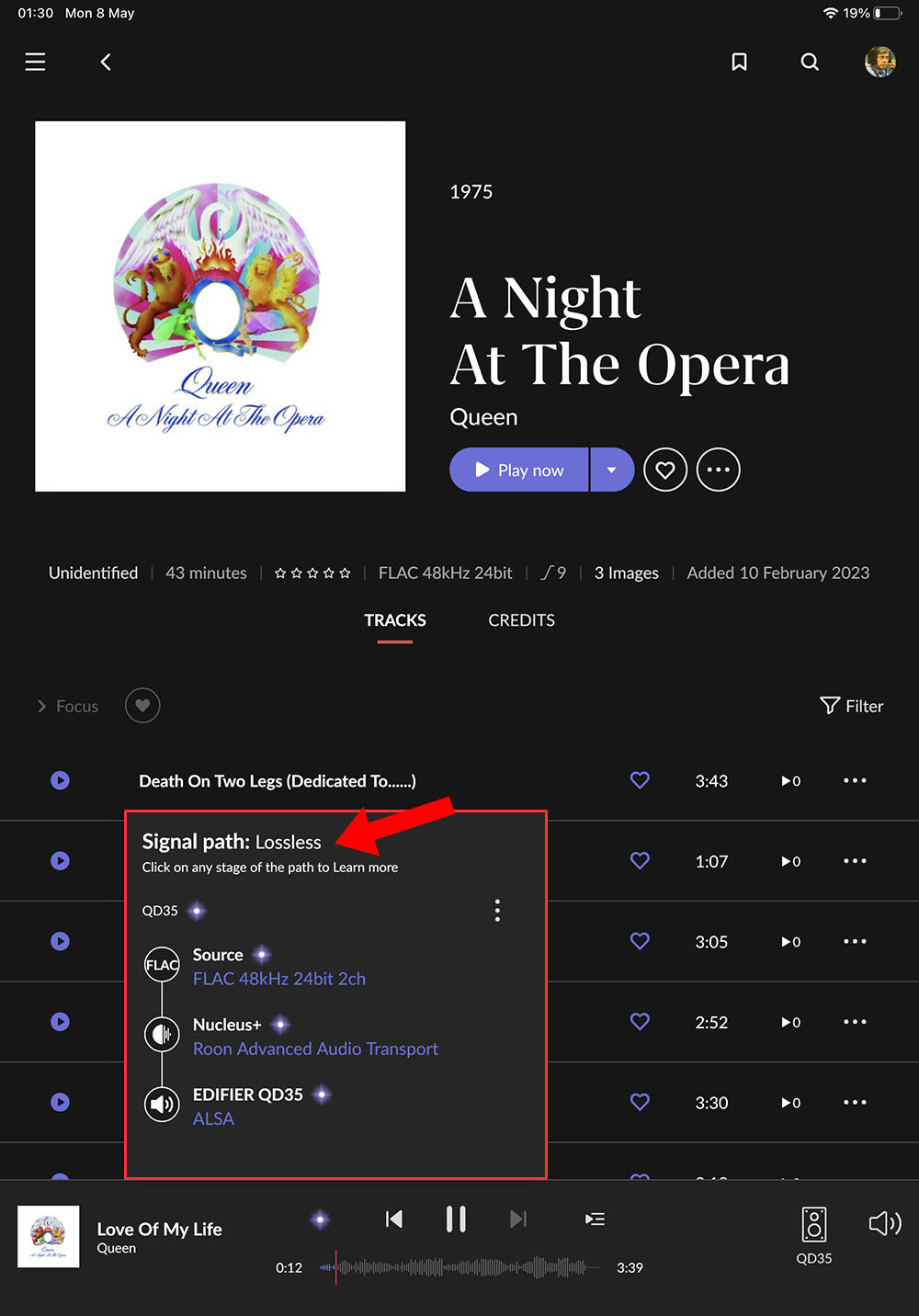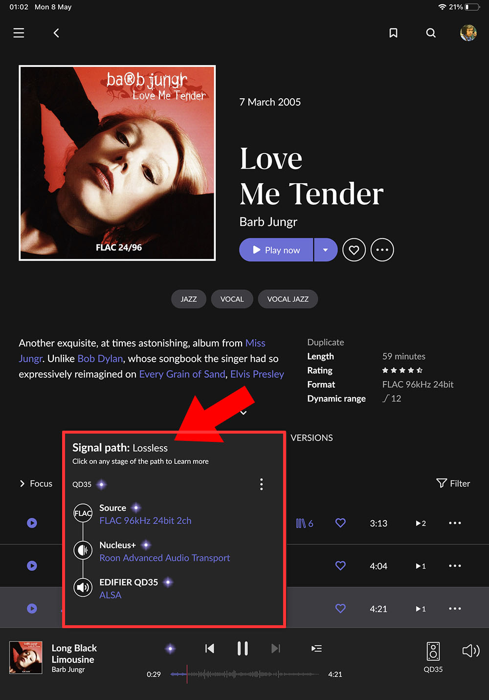 สถานะการณ์ค่อนข้างจะชี้ชัดว่า ภาค DAC ในตัว QD35 รองรับสัญญาณไฮเรซฯ ได้สูงสุดที่ระดับแซมปลิ้งที่ 96kHz เพื่อให้ชัวร์ ผมเลยเลือกไฟล์เพลง FLAC 24/96 มาลองเล่นดู ปรากฏว่าโป๊ะเช๊ะ.. โปรแกรม Roon เล่นไฟล์ FLAC ของอัลบั้มนี้ออกมาเป็นสัญญาณ 24/96 แล้วส่งออกไปที่ภาค DAC ของ QD35 โดยไม่ทำการแตะต้องใดๆ (*สังเกตที่ signal path ตรงศรชี้พบว่า เมื่อเล่นไฟล์นี้โปรแกรมแสดงออกมาเป็นคุณภาพระดับ ‘Lossless’ ซึ่งตามมาตรฐานของโปรแกรม Roon ที่ระดับ Lossless จะเป็นระดับคุณภาพที่สูงกว่าที่ระดับ ‘High quality’ ขึ้นมาอีกขั้น เพราะสัญญาณอินพุตไม่ถูกเปลี่ยนแปลงใดๆ นั่นเอง)