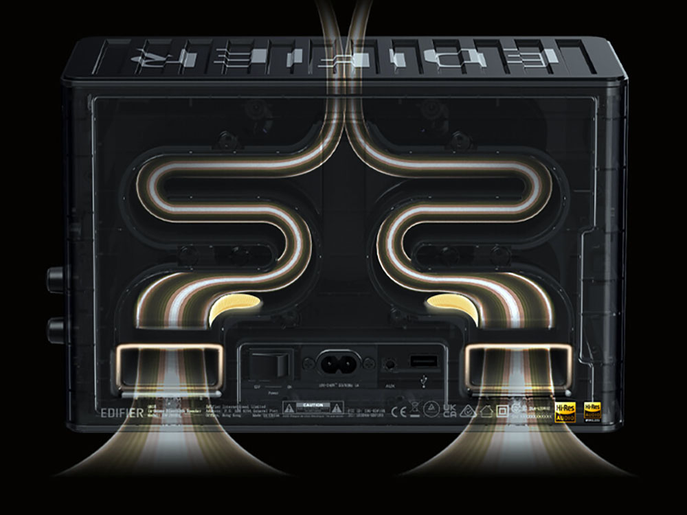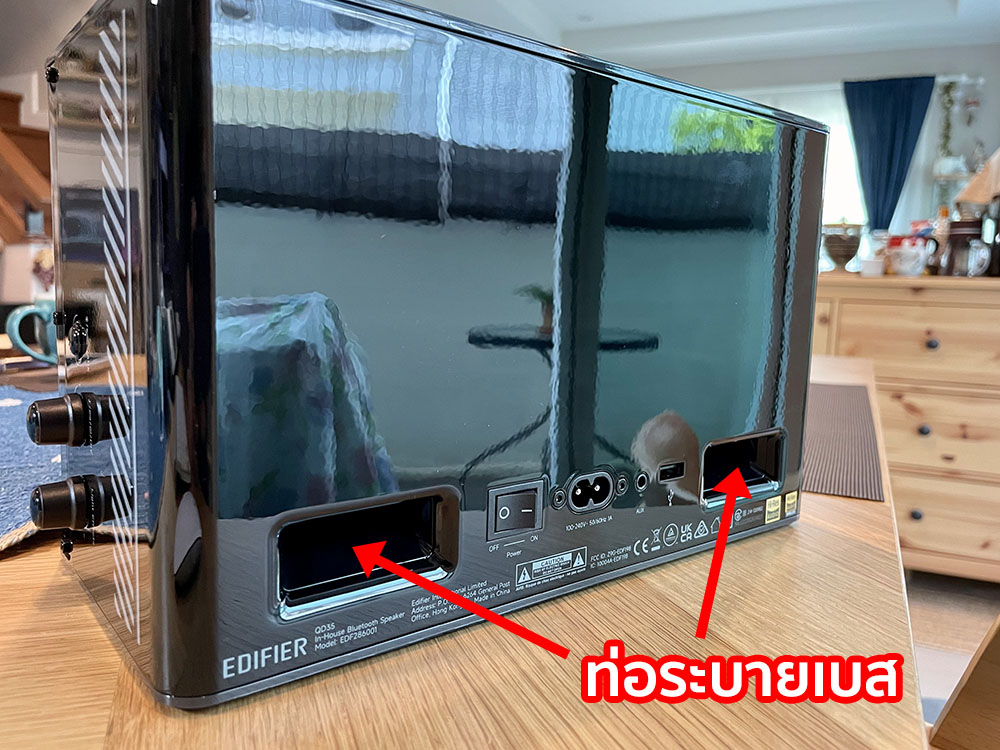 บริเวณส่วนล่างของแผงหลังจะมีช่องอินพุตต่างๆ เรียงอยู่จำนวนหนึ่ง กับท่อระบายเบส 2 ท่อที่วิศวกรของ Edifier ออกแบบขึ้นมาเป็นพิเศษ โดยตั้งชื่อเรียกไว้ว่า ‘MazeTube Bass Reflex Channels’ เพื่อสร้างความถี่ต่ำเสริมให้กับดอกมิด/วูฟเฟอร์ที่อยู่ด้านหน้า นอกจากนั้น พวกเขายังได้คิดค้นเทคโนโลยีในการขจัดเสียงรบกวน (noise) ที่เกิดจากลมที่เสียดสีกับท่อ บวกกับเสียงที่เกิดจากการสั่นกำธรของท่อออกมาด้วย โดยตั้งชื่อเรียกว่า ‘TurbMuff Air Noise’ และนี่แหละคือเคล็ดลับที่ทำให้ตัวมิด/วูฟเฟอร์ขนาด 3 นิ้วสามารถสร้างเสียงทุ้มออกมาได้มโหฬารเกินตัว..!!!