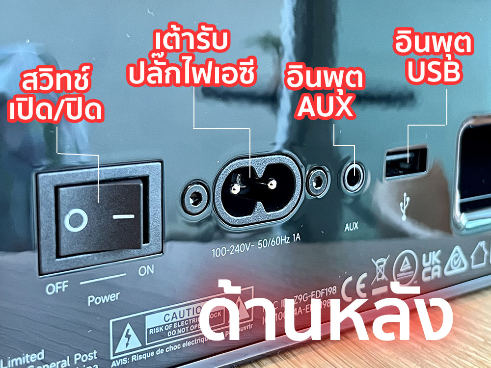 ปุ่มแรก (1) ทำหน้าที่ต่อเนื่องกับเมนสวิทช์ที่ใช้ปิด/เปิดไฟเข้าเครื่องที่อยู่บนแผงหลังของตัวเครื่อง เมื่อกดเมนสวิชท์ไปที่ตำแหน่ง On ปุ่มหมายเลข 1 นี้จะทำหน้าที่เปิดใช้งานเมื่อกดลงบนปุ่มหนึ่งครั้ง และจะเปลี่ยนไปอยู่ในโหมดสแตนด์บายเมื่อกดปุ่มนี้ค้างไว้ 1.5 วินาที และอีกหน้าที่ของปุ่มนี้คือใช้สำหรับ เลือกแหล่งอินพุต เมื่อเครื่องอยู่ในสถานะ On หรือเปิดพร้อมทำงาน เมื่อคุณกดลงไปที่ปุ่มหมายเลข 1 หนึ่งครั้งโดยไม่ต้องแช่ ในแต่ละครั้งที่กดลงไปบนปุ่มนี้ จะเป็นการเลื่อนเปลี่ยนอินพุตทั้งสามคือไล่จาก Bluetooth > USB > AUX วนไป