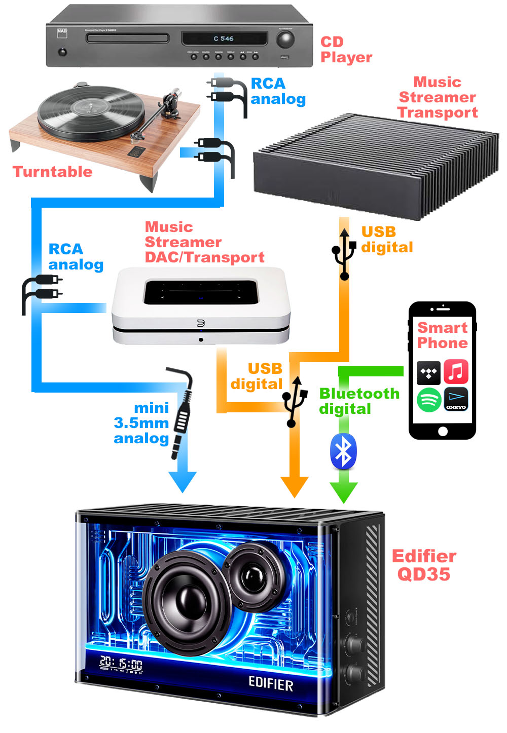 2) รองรับสัญญาณอินพุตดิจิตัล ผ่านเข้าทางอินพุต USB-A ซึ่งสามารถรับสัญญาณจากการเล่นไฟล์บนคอมพิวเตอร์ หรือเล่นไฟล์บนสตรีมเมอร์ที่มีเอ๊าต์พุต USB-A อย่างเช่น Roon Nucleus หรือ Bluesound NODE รุ่นใหม่ (เส้นสีส้มในภาพด้านบน) โดยใช้สายสัญญาณ USB-A > to > USB-A ที่แถมมาให้ในกล่อง (* อินพุตนี้นับว่าแปลก เพราะปกติถ้าเป็นอินพุต USB-A มักจะรองรับการเล่นไฟล์เพลงจากอุปกรณ์พกพาประเภทแฟรชไดร้ USB มากกว่าที่จะรอรับสัญญาณจากคอมพิวเตอร์ ที่เป็นแบบนี้ก็เพราะว่าในตัว QD35 ไม่มีโปรแกรมเล่นไฟล์เพลง USB Audio Player นั่นเอง)