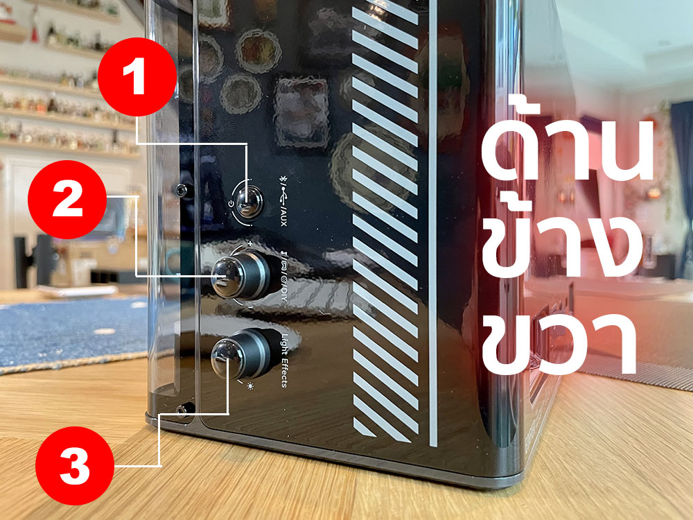ปุ่มที่ 3 ก็ทำหน้าที่สองอย่างเหมือนกัน อย่างแรกคือกดเพื่อเลือก “Light Effects” หรือรูปแบบของไฟ LED ที่โชว์อยู่บนแผงด้านหน้าของตัวเครื่อง ซึ่งมีให้เลือกหลายรูปแบบ ส่วนอีกหน้าที่คือใช้หมุนเพื่อเพิ่ม/ลดความสว่างของไฟ LED ที่โชว์อยู่บนแผงหน้า