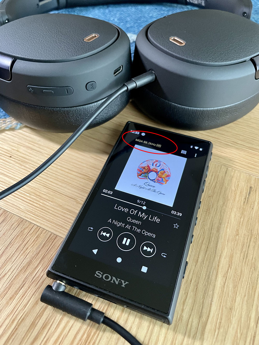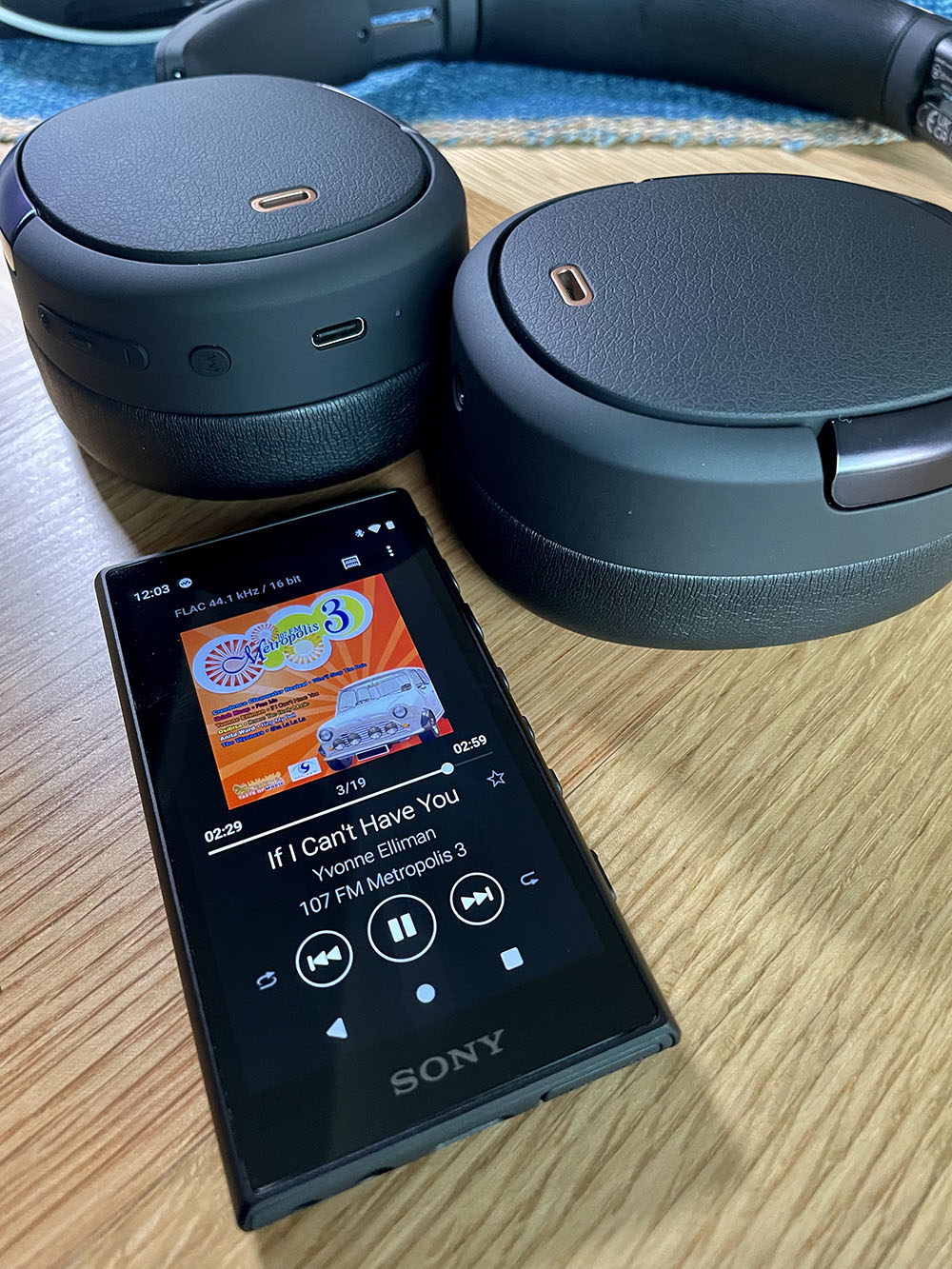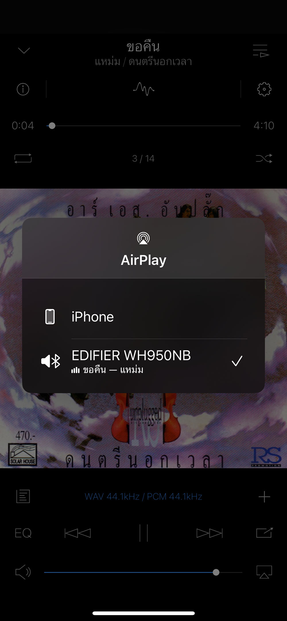 ผมทดลองฟังเสียงของ WH950NB โดยใช้สมาร์ทโฟนแอ๊ปเปิ้ล iPhone 12 เล่นไฟล์เพลงที่ผมเก็บอยู่ในฮาร์ดดิสของ iPhone 12 ด้วยแอพลิเคชั่น Onkyo HF Player เปรียบเทียบกับเล่นไฟล์เพลงเดียวกัน แต่เก็บอยู่ในอินเทอร์นัล ฮาร์ดดิสของเครื่องเล่นไฟล์เพลงพกพาของ Sony รุ่น NW-A105 โดยที่ผมใช้วิธีเชื่อมต่อระหว่าง iPhone 12 และ A105 กับหูฟัง WH950NB ผ่านทาง Bluetooth ทั้งคู่พร้อมกัน (เข้าไปตั้งที่หัวข้อ Dual-Device Conection ในแอพ Edifier Connect ไว้ที่ตำแหน่ง ‘ON’) จึงง่ายต่อการฟังเปรียบเทียบสลับไปสลับมา