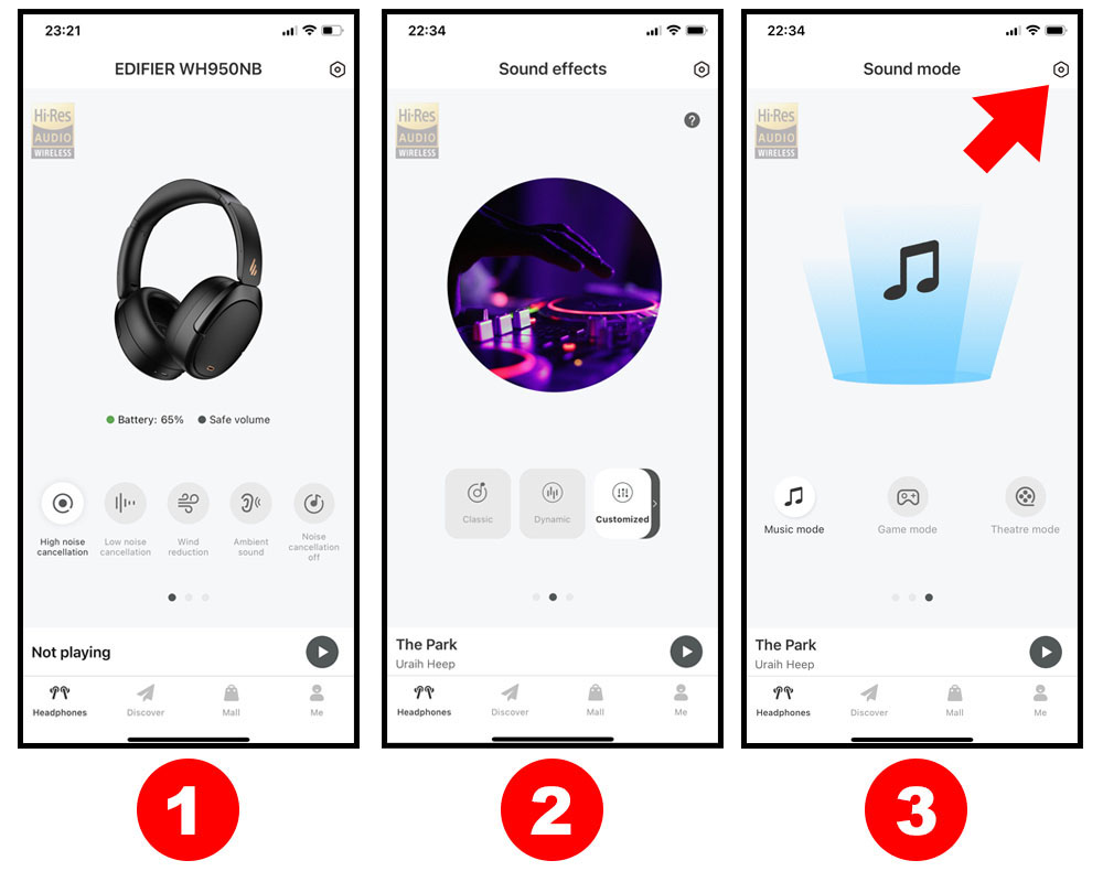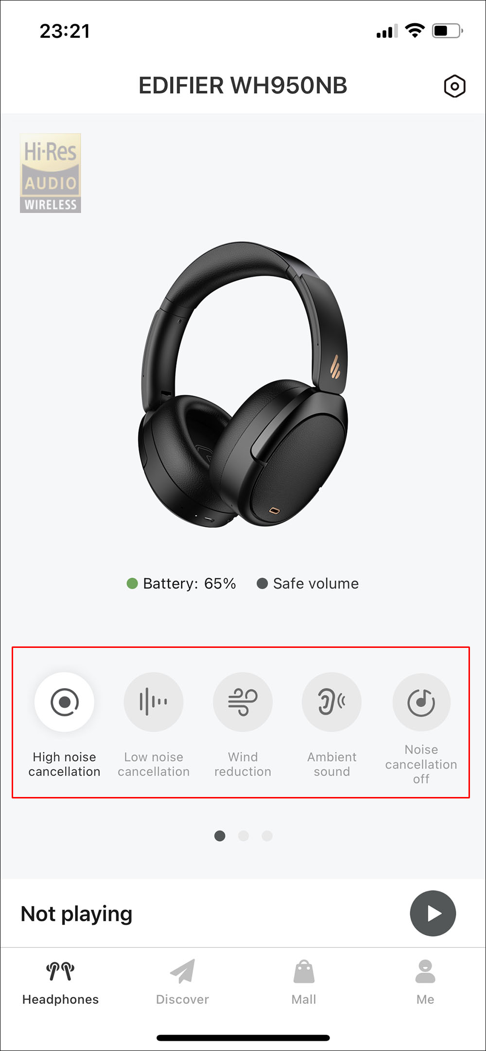ระบบตัดเสียงรบกวน (Noise Cancellation) ที่ติดตั้งมาให้ในรุ่น WH950NB (กรอบสีแดงในภาพ) เป็นระบบที่มีความล้ำหน้าไปกว่าระบบตัดเสียงรบกวนที่เคยมีมาในอดีต เป็นระบบตัดเสียงรบกวนแบบ active ที่ควบคุมด้วยแอพลิเคชั่นที่สามารถเลือกระดับการตัดสัญญาณภายนอกได้ 2 ระดับ คือ “High noise cacellation” = ตัดเสียงภายนอกแบบสนิท กับ “Low noise cancellation” = ตัดเสียงภายนอกบางส่วน นอกจากนั้น ยังมีอ๊อปชั่นพิเศษๆ มาให้เลือกใช้เพิ่มเติมอีก 2 โหมด คือ “Wind reduction” = ตัดเสียงลมขณะใช้งานหูฟังภายนอกอาคารที่มีลมพัด กับอีกโหมดคือ “Ambient sound” = เปิดไมค์รับเสียงจากภายนอกเพื่อการรับรู้สภาพภายนอกที่ชัดเจนและใช้เพื่อการสนทนาโดยไม่ต้องเอาหูฟังออก ซึ่งฟังท์ชั่น Noise Cancellation ทั้งหมดนี้สามารถเลือกใช้ได้ง่ายๆ ผ่านแอพลิเคชั่นที่ชื่อว่า “Edifier Connect”