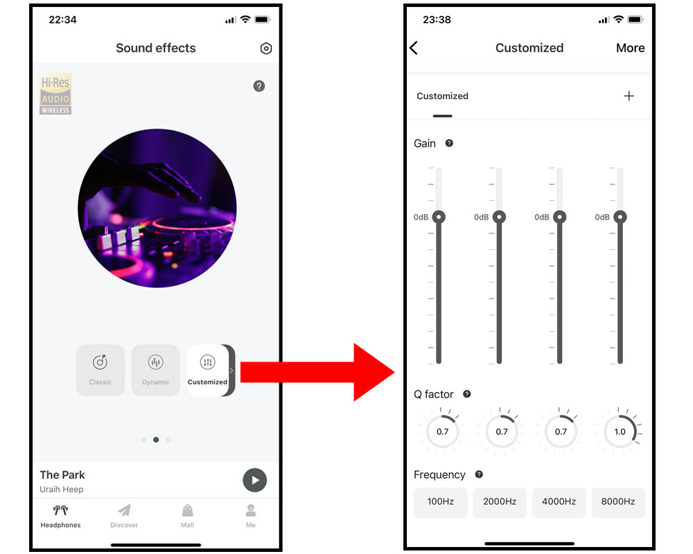 ในแอพฯ มีรูปแบบการปรับตั้ง EQ แบบสำเร็จรูปมาให้ 2 แบบ คือ Classic กับ Dynamic ถ้าใช้แล้วเสียงยังไม่ถูกใจคุณ ยังมีหัวข้อ Customized ให้เข้าไปปรับตั้งด้วยตัวเองอีกหนึ่งช่องทาง เมื่อใช้ปลายนิ้วจิ้มลงไปที่หัวข้อ ‘Customized’ หน้าแอพฯ จะเปิดเข้าไปที่หน้าปรับแต่งเสียงที่แยกเป็น 4 ช่วงความถี่ คือ 100Hz, 2000Hz, 4000Hz และ 8000Hz โดยแต่ละช่วงความถี่จะมีพารามิเตอร์ให้คุณปรับจูนอีก 2 ตัว คือ gain กับ Q factor