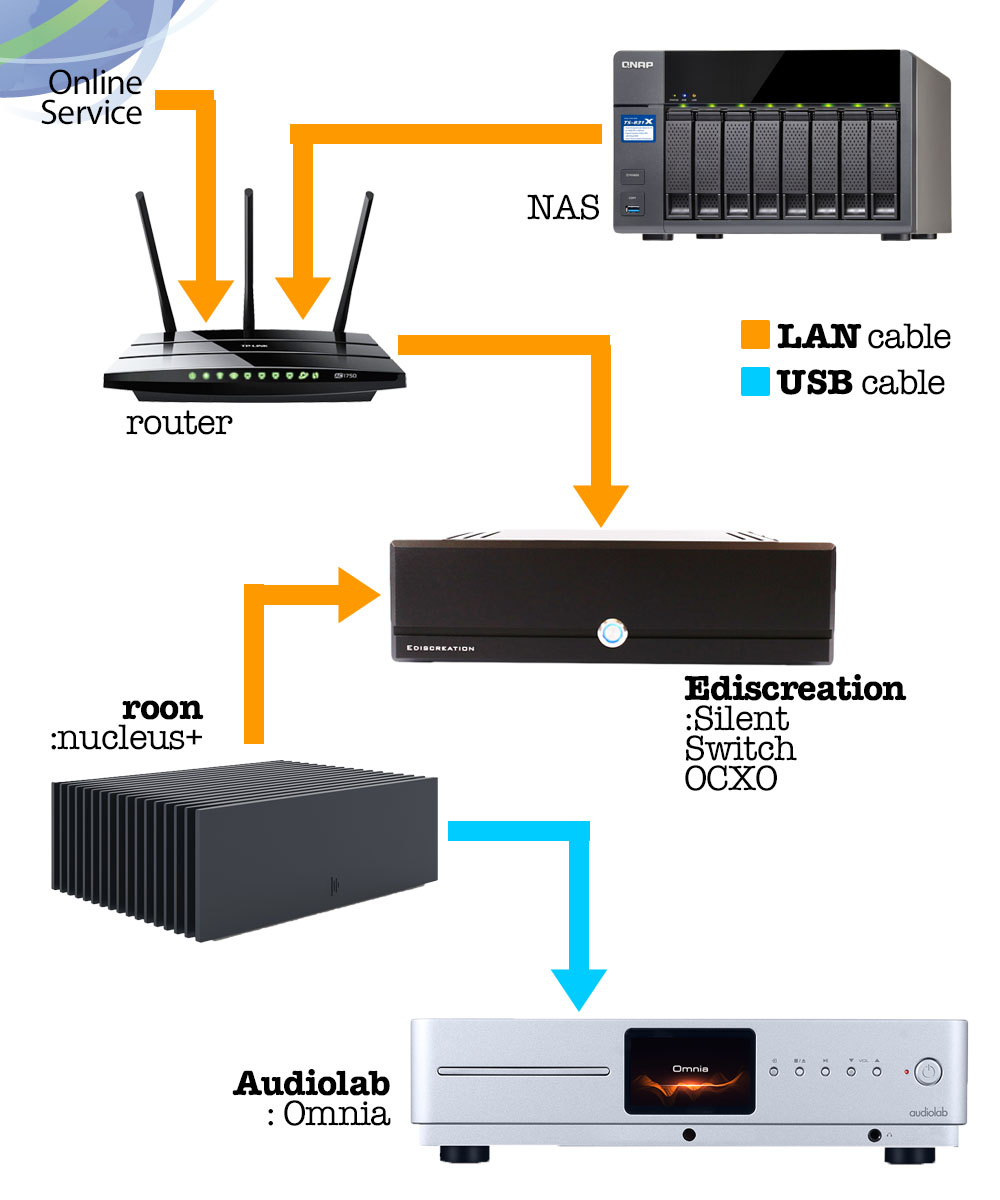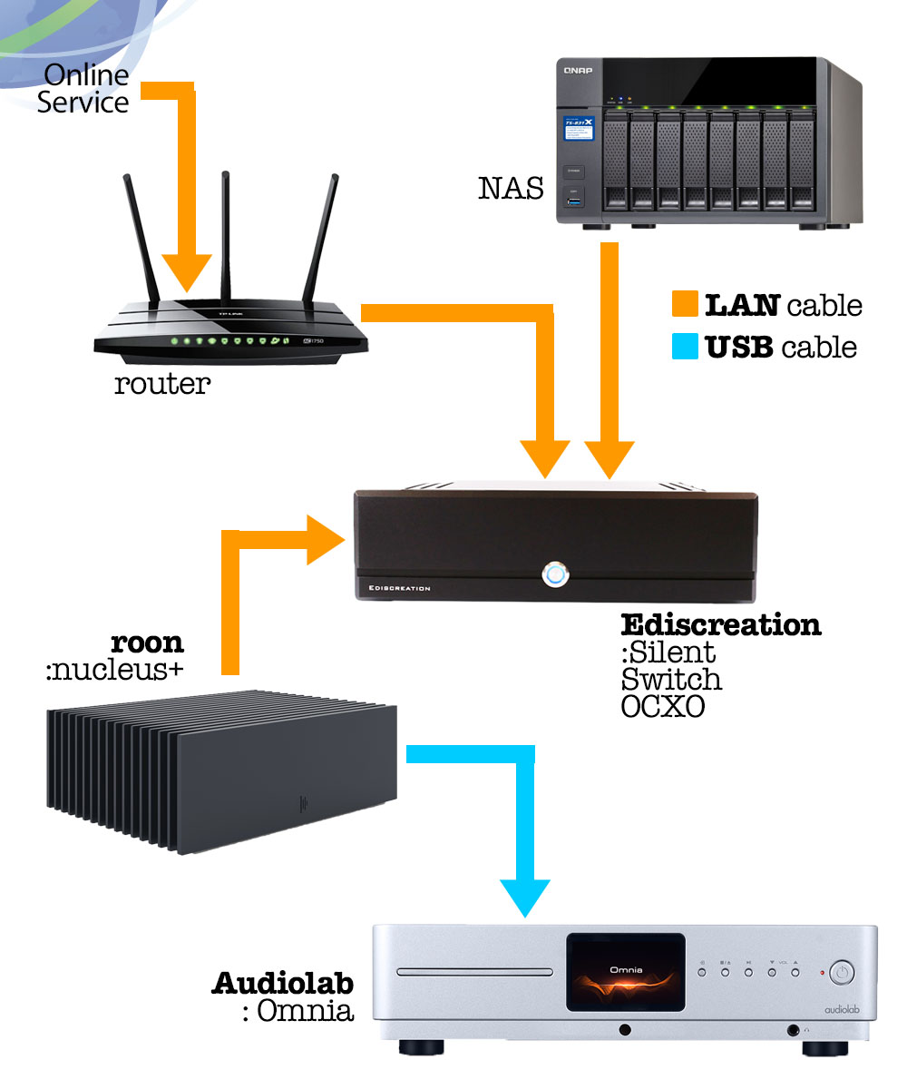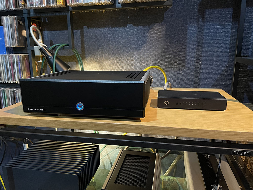 ในการทดลองฟังเสียงครั้งนี้ซึ่งเป็นกรณีสมมุติว่าใช้ตัว Silent Switch OCXO แค่ตัวเดียว ผมพบว่า เมื่อต่อใช้งานตัว Silent Switch OCXO คั่นไว้ระหว่างตัว router กับตัวสตรีมเมอร์คือ Roon nucleus+ ตัวเดียวมันให้ผลลัพธ์ทางเสียงที่ดีกว่า จึงใช้ลักษณะการเชื่อมต่อแบบนี้ในการประเมินผลทางเสียงของตัว EdiscreationSilent Switch OCXO ครั้งนี้