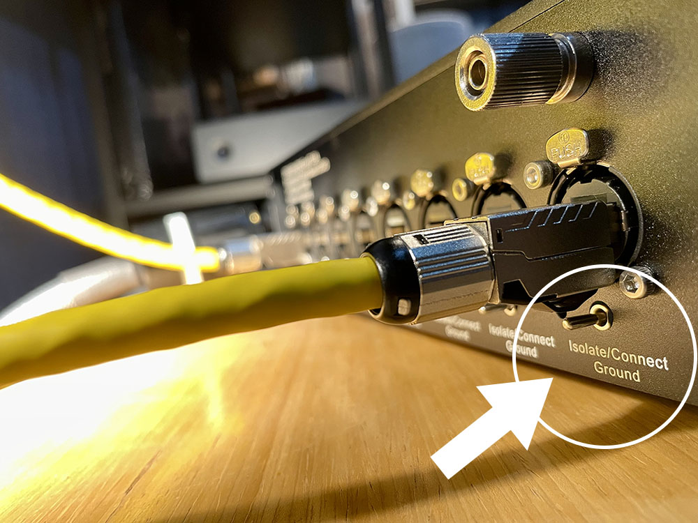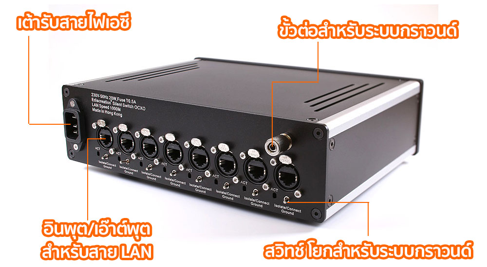 ไฮไล้ท์ของตัวเน็ทเวิร์ค สวิทช์ตัวนี้อยู่สวิทช์โยก (ศรชี้ในภาพ) ที่ให้มาเพื่อใช้เลือกอ๊อปชั่นระหว่าง เชื่อมต่อ” (connect) กราวนด์จากสาย LAN เข้ากับขั้วต่อที่ตัวเน็ทเวิร์ค สวิทช์ กับ แยกกันเด็ดขาด” (isolate) คือไม่ต่อสัญญาณกราวนด์จากสาย LAN มาที่ตัวเน็ทเวิร์ค สวิทช์ ซึ่งเป็นฟังท์ชั่นพิเศษของตัว Silent Switch OCXO ที่มีมาให้ใช้แก้ปัญหากราวนด์ลูปที่อาจจะเกิดขึ้นกับชุดเครื่องเสียง เพราะการเอาระบบเน็ทเวิร์คที่ปกติใช้งานอยู่ในวงการไอที/คอมพิวเตอร์มาใช้กับชุดเครื่องเสียงโดยมากมักจะพบกับปัญหาของสัญญาณรบกวน (noise) ที่เกิดจากอุปกรณ์ในระบบเน็ทเวิร์คฯ อย่างเช่น router และ modem ซึ่งสร้าง noise ในระดับความถี่สูงแทรกเข้ามาได้ ซึ่งทางบริษัทผู้ผลิตเน็ทเวิร์ค สวิทช์ตัวนี้เล็งเห็นปัญหานี้ จึงได้ออกแบบฟังท์ชั่นที่ใช้ในการควบคุมการเชื่อมต่อระบบกราวนด์ที่ว่านี้ขึ้นมา