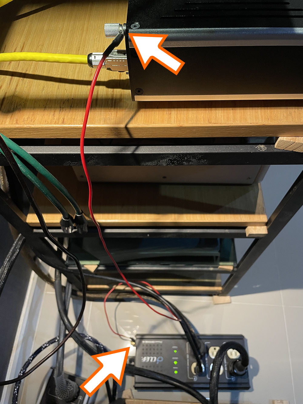 แต่ในกรณีที่ต้องการใช้ตัว Silent Switch OCXO เป็น สะพานถ่ายเทกราวนด์ของชุดเครื่องเสียงให้ไหลไปลงดิน (earth) คุณต้องหาสายกราวนด์มาเชื่อมต่อตรงจุดที่ Silent Switch OCXO ทำไว้ให้ (ศรชี้ด้านบน) แล้วโยงสายกราวนด์ (เส้นสีแดงในภาพด้านบน) ไปที่จุดถ่ายกราวนด์บนตัวกรองไฟ หรือจุดต่อกราวนด์ที่อยู่ใกล้กับจุดต่อแท่งกราวนด์ลงดินให้มากที่สุด กรณีที่บ้านผมใช้ระบบกราวนด์ที่ไปอ้างอิงกับระบบกราวนด์ของการไฟฟ้าที่เดินลงเสาไฟฟ้าหน้าบ้าน ซึ่งผมโยงสายกราวนด์จากตู้เมนหลักชั้นสองลงมาที่ตู้เมนย่อยในห้องฟังแล้วกระจายไปที่เต้ารับบนผนังห้องฟังทุกตัว เมื่อเอาสายไฟเอซีแบบ IEC สามขาแยกกราวนด์เสียบจากเต้ารับบนผนังไปที่ตัวกรองไฟ PowerBRIDGE 6 ของ Clef Audio นั่นก็เท่ากับว่า ขั้วต่อสายกราวนด์ของ PowerBRIDGE 6 ทำตัวเป็นสะพานที่ใช้ถ่ายเทสัญญาณกราวนด์ของชุดเครื่องเสียง+อุปกรณ์ในระบบเน็ทเวิร์คออกไปจากระบบนั่นเอง ในกรณีนี้ ผมพบว่า การสับสวิทช์ Ground ของ Silent Switch OCXO ไปที่ตำแหน่ง Isolate เพื่อแยกกราวนด์ของเน็ทเวิร์คฯ ไม่ให้แพร่มาถึงชุดเครื่องเสียงให้ผลลัพธ์ทางเสียงที่ดีกว่า