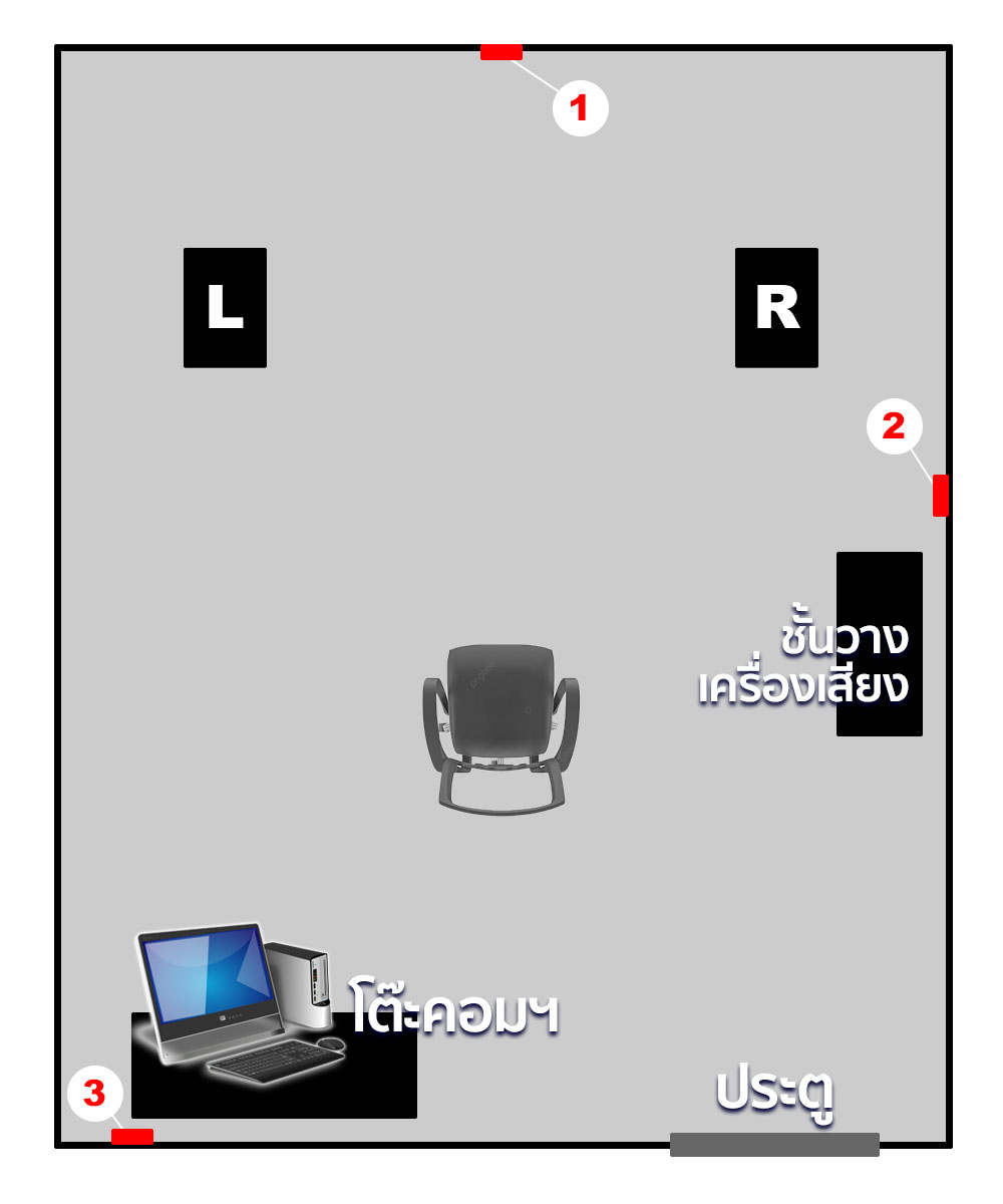 ส่วนจุดเชื่อมต่อสาย LAN จุดที่สามอยู่ที่ผนังด้านหลังตำแหน่งนั่งฟัง ตรงมุมด้านซ้าย ซึ่งตรงนั้นผมมีโต๊ะวางคอมพิวเตอร์ที่ผมใช้ริปแผ่นซีดีและติดตั้ง NAS ที่ใช้เก็บไฟล์เพลงไว้ตรงนั้น จุดเชื่อมสาย LAN ตรงจุดนี้ก็ทำไว้เพื่อใช้เชื่อมต่อ NAS เข้ากับระบบเน็ทเวิร์คนั่นเอง ซึ่งจุดเชื่อมต่อสาย LAN ทั้งสามจุดนี้ผมใช้วิธีลากสาย LAN เดินยาวมาจากตัว router/modem ของ AIS โดยตรง เรื่องสัญญาณรบกวนจึงเจอเต็มๆ ทั้ง noiseในระบบที่มาจาก router และ noiseนอกระบบที่มาจากคลื่นขยะต่างๆ ในอากาศ ต้องหาตัว network switch เข้ามาต่อพ่วงระหว่างจุดรับสาย LAN บนผนังห้องก่อนจะไปเข้าที่ตัวอุปกรณ์เครื่องเสียง ซึ่งจุดที่ผมใช้งานประจำก็คือจุดที่ 2 ตรงด้านข้างชั้นวางเครื่องเสียง กับจุดที่ 3 ใกล้โต๊ะคอมฯ ตรงมุมห้องด้านหลังตำแหน่งนั่งฟัง ส่วนตำแหน่งที่ 1 บนผนังด้านหลังตำแหน่งวางลำโพงนั้นจะใช้กับตัว all-in-one ที่มีสตรีมเมอร์ในตัวเท่านั้น