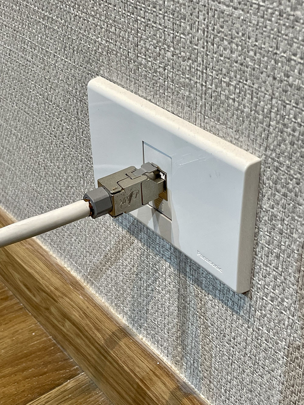 ที่ห้องฟังของผมติดตั้งจุดต่อสาย LAN เอาไว้บนผนังทั้งหมด 3 จุด จุดแรกอยู่บนผนังบริเวณด้านหลังตำแหน่งวางลำโพง (ดูภาพประกอบข้างบน) ตรงนี้สำหรับใช้กับอุปกรณ์ประเภท all-in-one หรือ Streamer DAC ที่มีภาคแอมปลิฟายในตัว ส่วนจุดที่สองอยู่บนผนังด้านข้างขวามือของตำแหน่งนั่งฟัง ใกล้กับชั้นวางเครื่องเสียง จุดนี้ไว้เชื่อมต่อกับอุปกรณ์ประเภท Streamer+DAC+Pre อย่างเช่น Audiolab รุ่น Omnia หรือใช้กับตัว Streamer Transport อย่างเช่น Roon รุ่น Nucleus หรือ Primare รุ่น NP5 Prisma MK II (REVIEW)