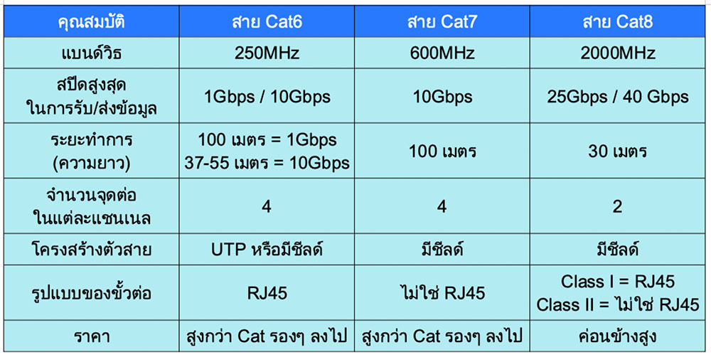 สเปคฯ ของสาย LAN หรือสาย Ethernet (จริงๆ แล้วต้องเรียกชื่อเต็มๆ ว่า “Gigabit Ethernet”) CAT8 เป็นมาตรฐานใหม่ล่าสุด จะเห็นว่ามันมีประสิทธิภาพในการรับ/ส่งข้อมูลและสัญญาณได้ สูงกว่าCAT6 และ CAT7 มาก คือถ้าวัดกันที่ระยะทำการ (ความยาวของสาย) อยู่ที่ 30 เมตร สาย CAT8 จะสามารถรับ/ส่งข้อมูลและสัญญาณได้มากกว่า CAT7 ถึง 2 เท่าครึ่ง.!! คือ 25Gbps (Class I ต่อด้วยหัว RJ45)