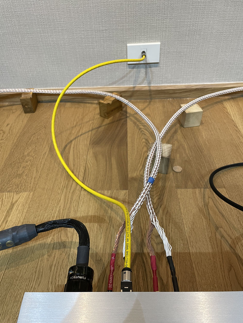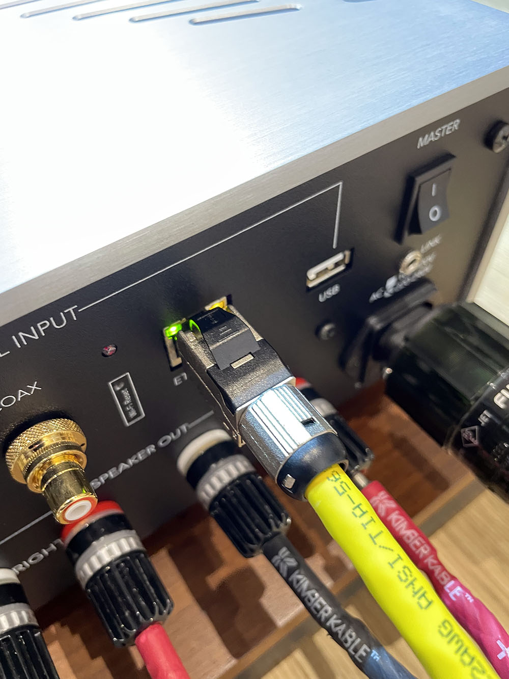 ส่วนอีกเส้นที่ยาว 1 เมตร ผมเอาไว้เชื่อมต่อระหว่างเต้ารับบนผนังด้านหลังลำโพงไปที่อุปกรณ์เครื่องเสียงที่มีอินพุต network streaming ในตัวอย่างพวก all-in-one หรือ network DAC