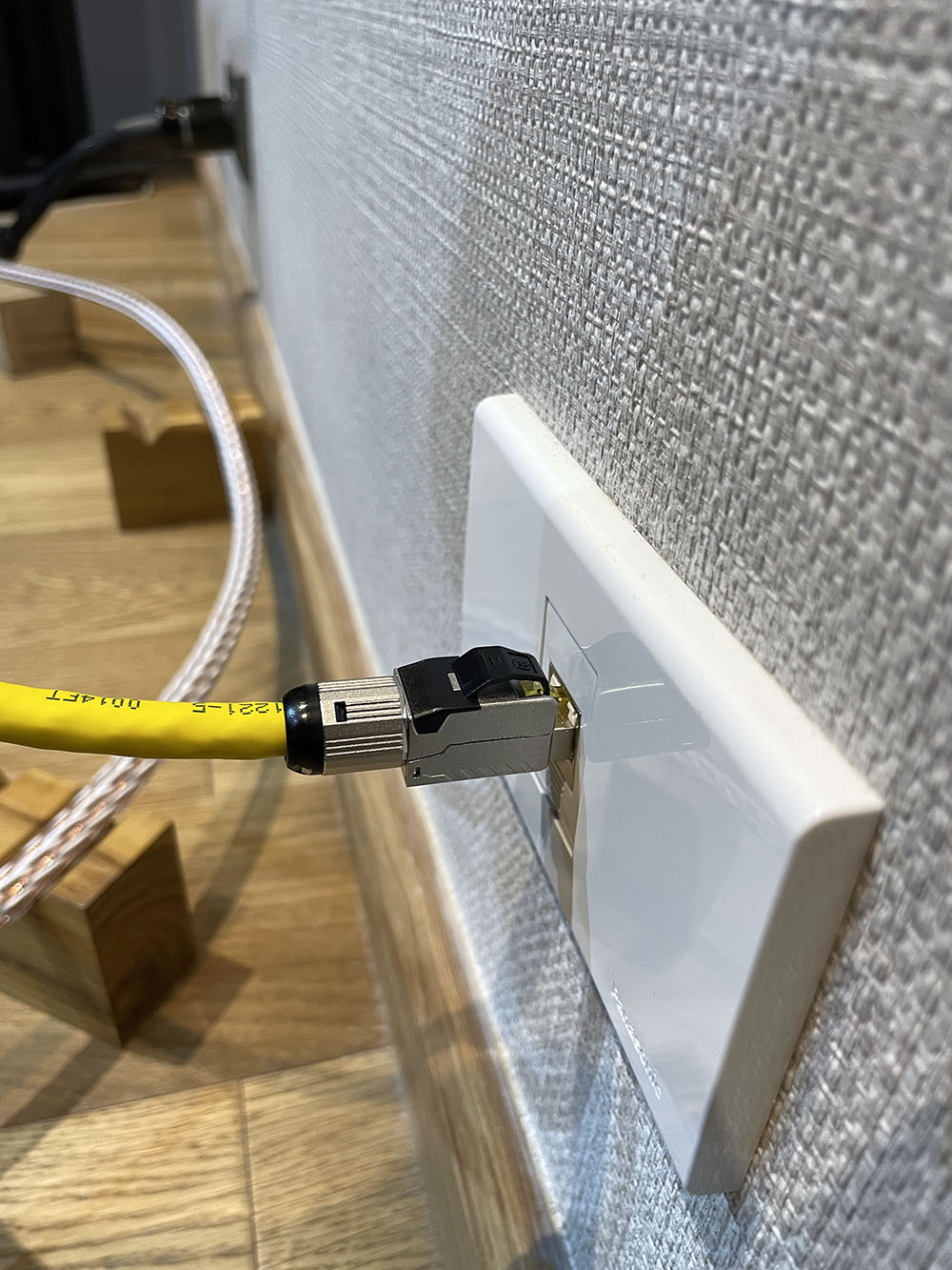 ต้องยอมรับว่า การติดตั้งระบบเน็ทเวิร์คในบ้านเป็นงานที่ควรจะอาศัยผู้ชำนาญเฉพาะทาง ซึ่งระบบที่บ้านผมนับว่าโชคดีที่ได้คุณอึ่ง เพื่อนนักเล่นฯ และมีอาชีพเป็นผู้ติดตั้งระบบเน็ทเวิร์คให้กับโรงงานอุตสาหกรรมมาช่วยดูแลให้ คุณอึ่งเลือกใช้สาย Ethernet CAT6a เดินแยกจาก Router ของผู้ให้บริการ AIS ที่รับมาจากสายไฟเบอร์ภายนอกเข้ามาที่ห้องฟังโดยตรง ซึ่งความยาวระหว่าง router เข้าไปที่ห้องฟังอยู่ราวๆ 40 – 50 เมตร ประเมินว่าน่าจะได้สปีดในการรับ/ส่งข้อมูลและสัญญาณอยู่ที่แถวๆ 10Gbps เหตุผลที่ไม่ไปถึง CAT8 ในตอนนั้น (ปีกว่าๆ ที่ผ่านมา) เนื่องจากในขณะนั้นสาย CAT8 ยังไม่แพร่หลาย และที่มีอยู่ในขณะนั้นก็มีราคาสูงมากๆ ยังไม่คุ้มกับการลงทุน นอกจากเดินสาย CAT6a ในผนังแล้ว คุณอึ่งยังทำสาย Ethernet CAT6a สำหรับเชื่อมต่อระหว่างเต้ารับสาย LAN บนผนังกับเครื่องเสียงมาให้ผมใช้คู่กันด้วย