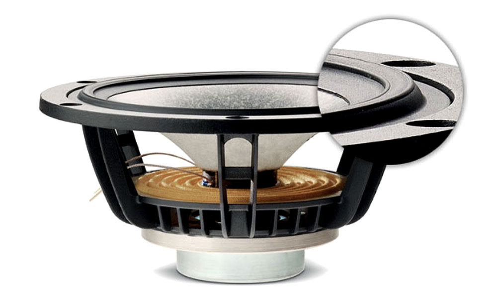 ข้อมูลในเว็บไซต์ของ Focal เองระบุชัดว่า พวกเขาให้ความสำคัญกับ เสียงกลาง” (midrange) เป็นพิเศษในการพัฒนาเทคนิคต่างๆ ขึ้นมาใช้กับการปรับจูนการทำงานของไดเวอร์มิด/เบสตัวนี้เพื่อให้มันตอบสนองเสียงกลางได้อย่างมีประสิทธิภาพสูงสุด นั่นคือนอกจากจะพัฒนาวัสดุที่ใช้ทำไดอะแฟรมจนได้ออกมาเป็น W Technology แล้ว พวกเขายังตามไปแก้ปัญหาอีกจุดหนึ่งที่มักจะเกิดขึ้นขณะที่ไดอะแฟรมของตัวมิด/เบสกำลังทำงาน นั่นคือปัญหาที่เรียกว่า “break upซึ่งเกิดขึ้นตอนที่ไดเวอร์ทำงานหนักจนถึงระดับเสียการทรงตัว ซึ่งเป็นลักษณะของขอบยาง (surround suspension) ที่เชื่อมโยงอยู่ระหว่างขอบนอกของไดอะแฟรมกับวงในของโครงโลหะ (basket) ที่ใช้ยึดไดอะแฟรมไม่สามารถยืดหยุ่นตัวรองรับแรงสั่นกระพือของไดอะแฟรมเอาไว้ได้ ทำให้ส่งผลเสียต่อความถี่ด้านบนๆ (upper midrange) ที่ตัวมิด/เบสรับภาระอยู่ ซึ่งเป็นย่านความถี่ที่เชื่อมต่อกับความถี่ด้านล่าง (lower-high frequency) ของเสียงแหลมที่เกิดจากการทำงานของทวีตเตอร์